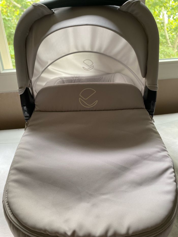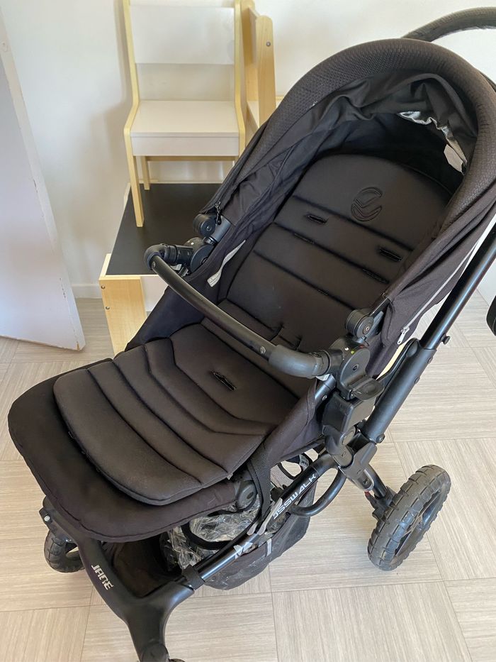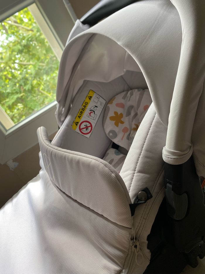 Poussette + cosy Le cosy et réglable en sièges auto Il y’a le protège pluie et un panier qui s’accroche en plus de celui en dessous de la poussette. Bon état tou terrains Défaut sur le guidon le cuir s’abîme .