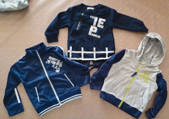 Lot de 2 gilets et 1 sweat bien portés en bon état Taille 86cm pour le sweat et le gilet bleu 3 an pour le gris mais équivalent aux autres