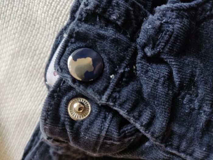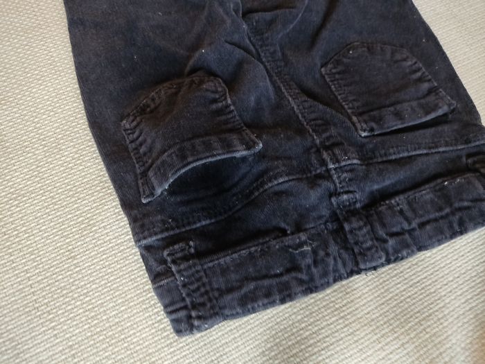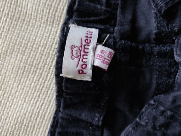 Pantalon, marque pommette, taille 18 mois (81cm), couleur noir. Réglable a la taille avec élastiques. Bouton pression pour fermeture a l'avant (la couleur s'est un peu écaillée sur ce bouton. 2 poches a l'avant, 2 poches a l'arrière. Bon état