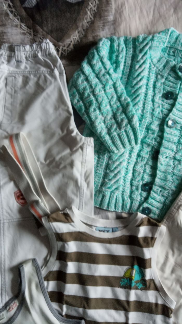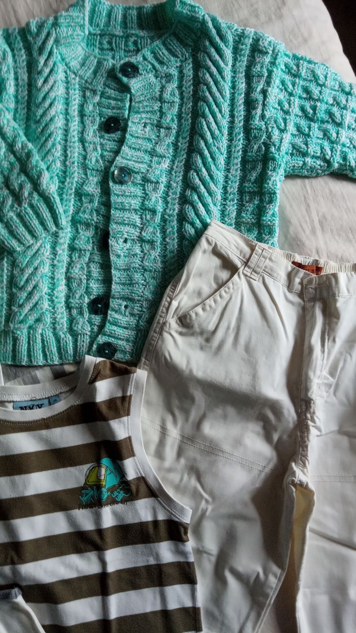 Lot VETEMENTS garçons en taille 8ans (128cm) - un PANTALON blanc cassé 100% Coton - Comme Neuf - un PANTALON blanc "Alphabet" 100% Coton multi poches avec ceinture assortie - Comme Neuf - un Gilet tricoté maison - d'occasion en bon état (quelques bouloches par endroit) - 2 T-Shirt style Marcel - d'occasion en bon état