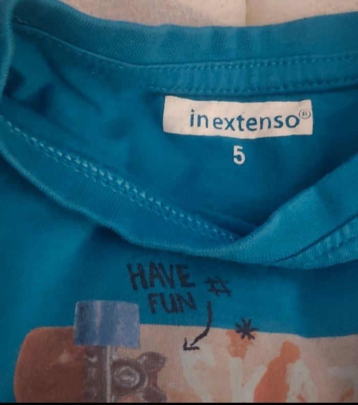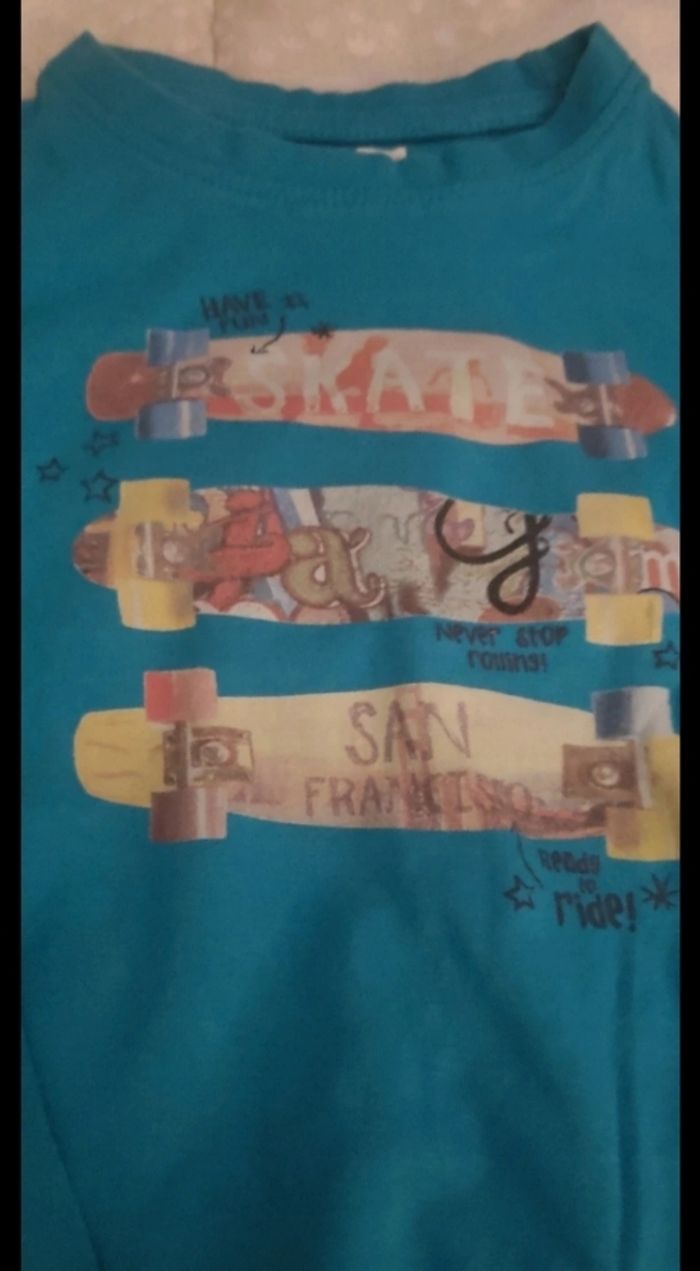 Maillot manches longues porté 2/3 fois. Il a des motifs skate sur fond turquoise Taille notée : 5 ans Marque: in extenso