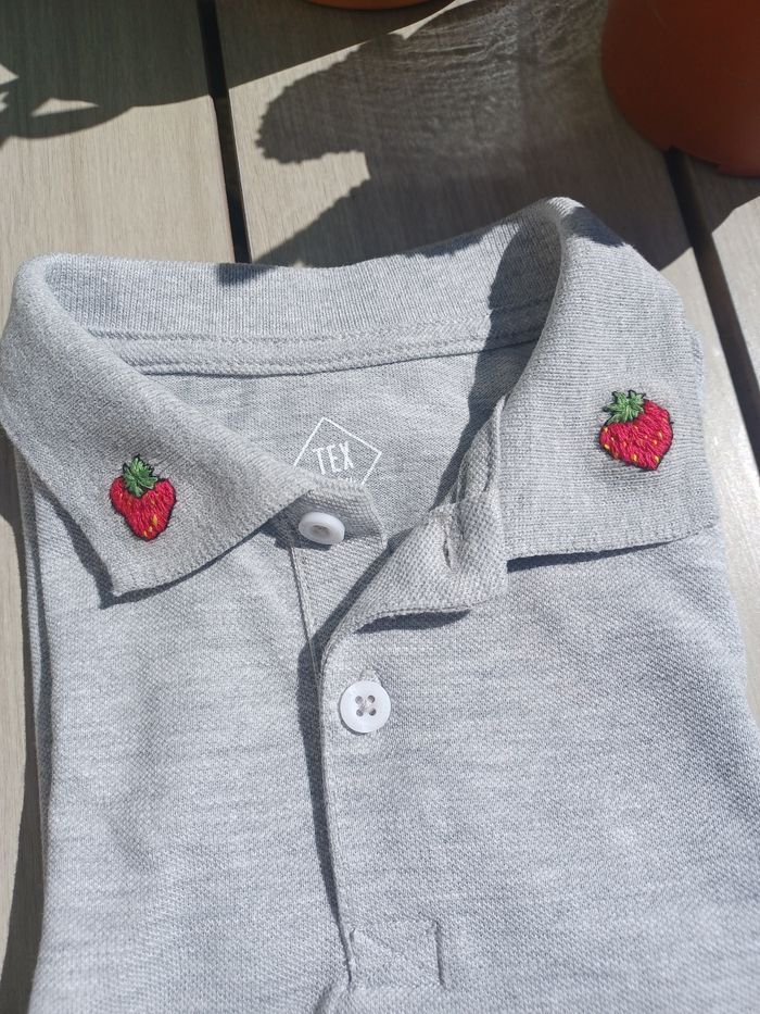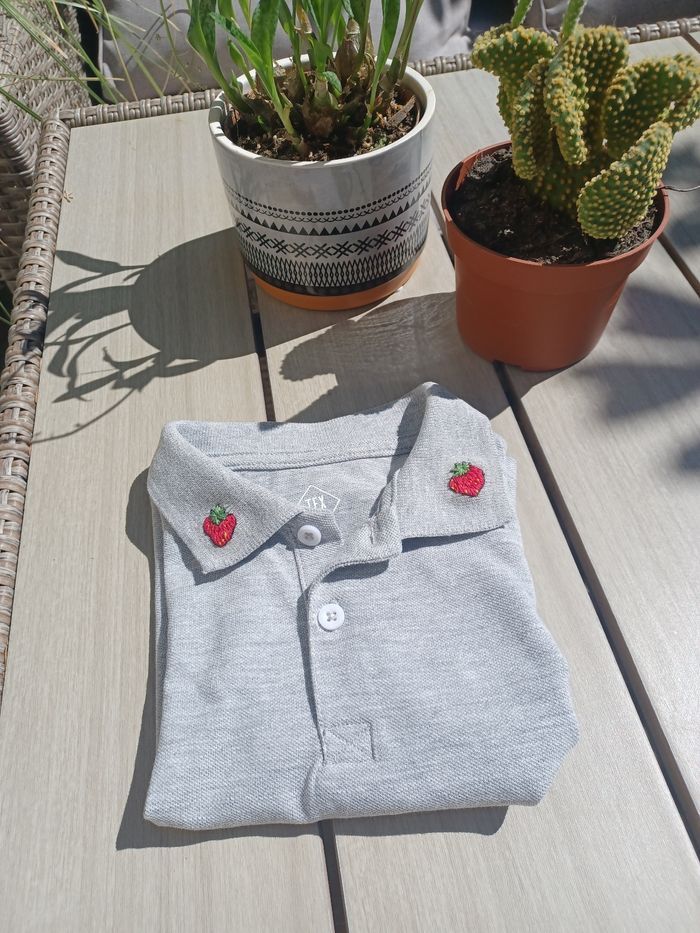 Bonjour, Je vends ce polo bébé 12 mois neuf (marque Tex baby), avec des fraises brodées à la main par mes soins. Chaque vêtement que je brodes est unique! Idéal pour un cadeau! N'hésitez pas à regarder ma boutique ❤️
