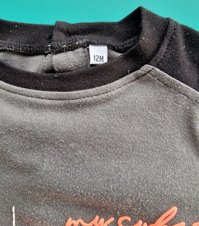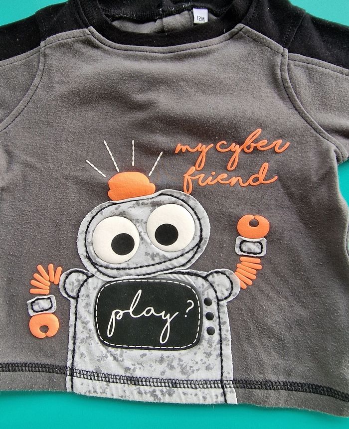 T shirt robot garçon taille 12 mois Manches longues Quelques bouloches et légèrement abîmé sur l écriture