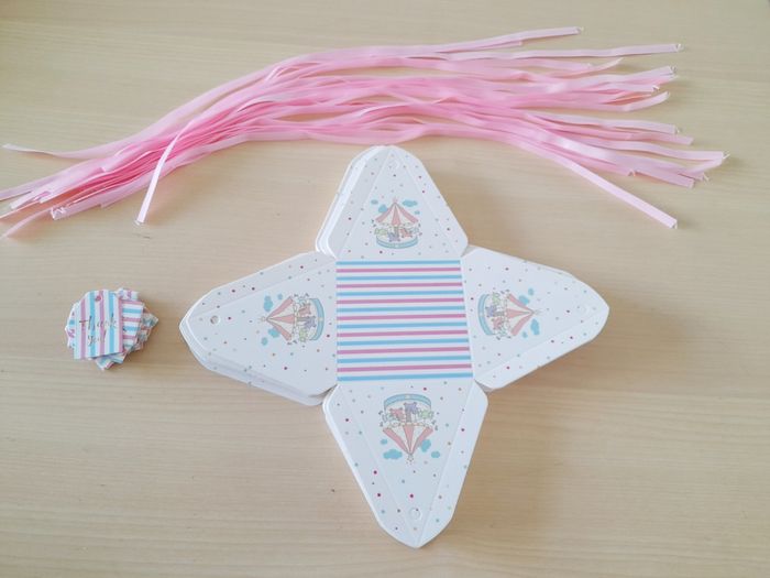 23 boîtes contenants à dragées thème fête foraine ainsi que 23 rubans pour refermer et 23 étiquettes Elles forment un tipi lorsqu'elles sont pliées