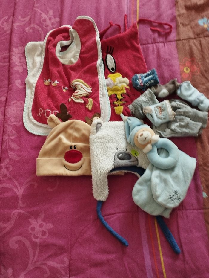 Lot comprenant bavoirs,hochet, bonnets, chaussettes et 1 paire de moufles