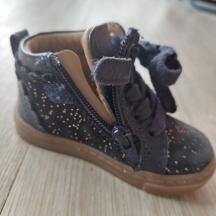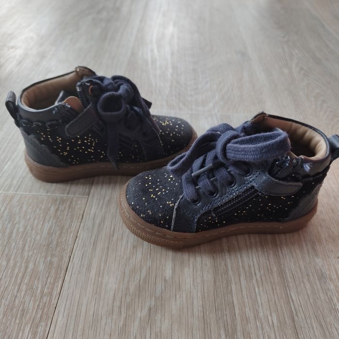 Chaussures chaudes bleu marine à paillettes dorées En fait et cuir Lacets pour ajuster le maintien, fermeture éclair et scratch sur le côté intérieur du pied Semelles intérieures et extérieures en parfait état Intérieur en cuire Très bon maintien du pied Taille 21 de chez Vertbaudet Très peu portées et en parfait état