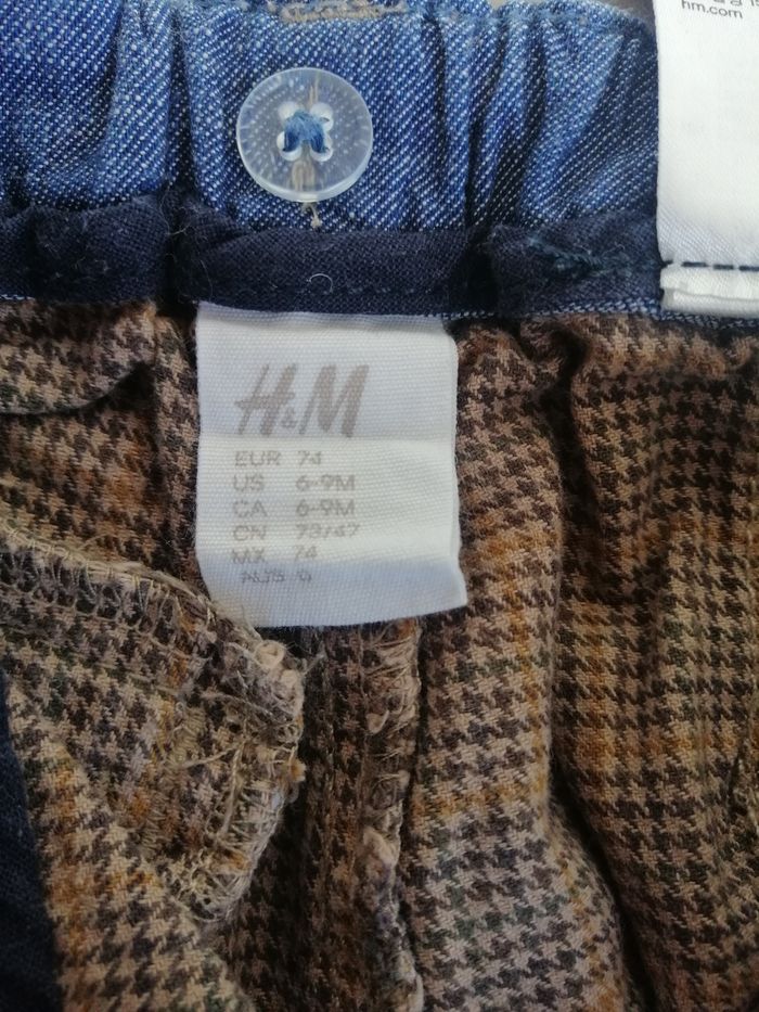 Lot de 3 pantalons 12 mois : - 1 jean Obaïbi - 1 pantalon jaune Obaïbi - 1 pantalon marron à carreaux H&M Les 3 sont en parfait état et ont été très peu portés (voire pas du tout)
