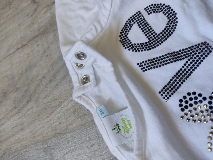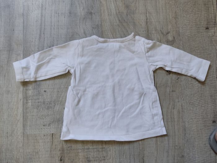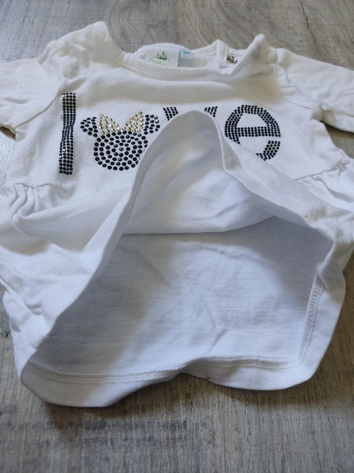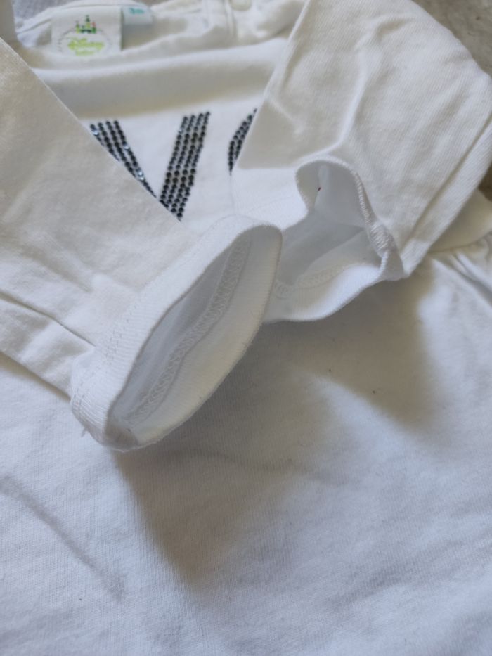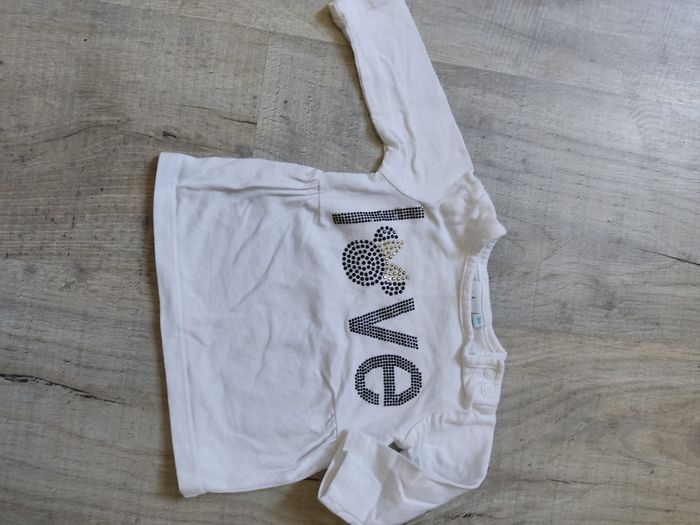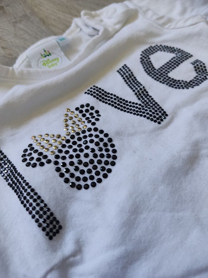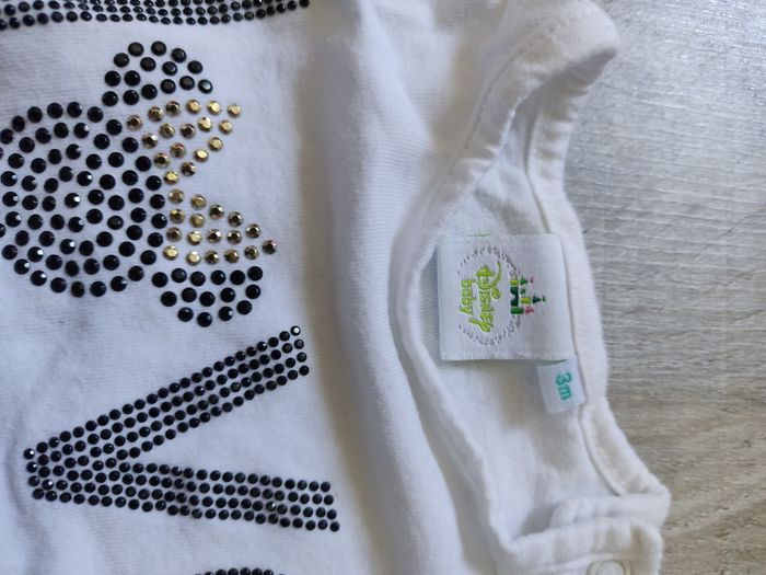T shirt manches longues en coton, marque Disney baby, couleur blanc, taille 3 mois. Motif en brillants noir et doré. Ouverture au niveau du col avec boutons pression pratique pour habiller bébé. Très bon état