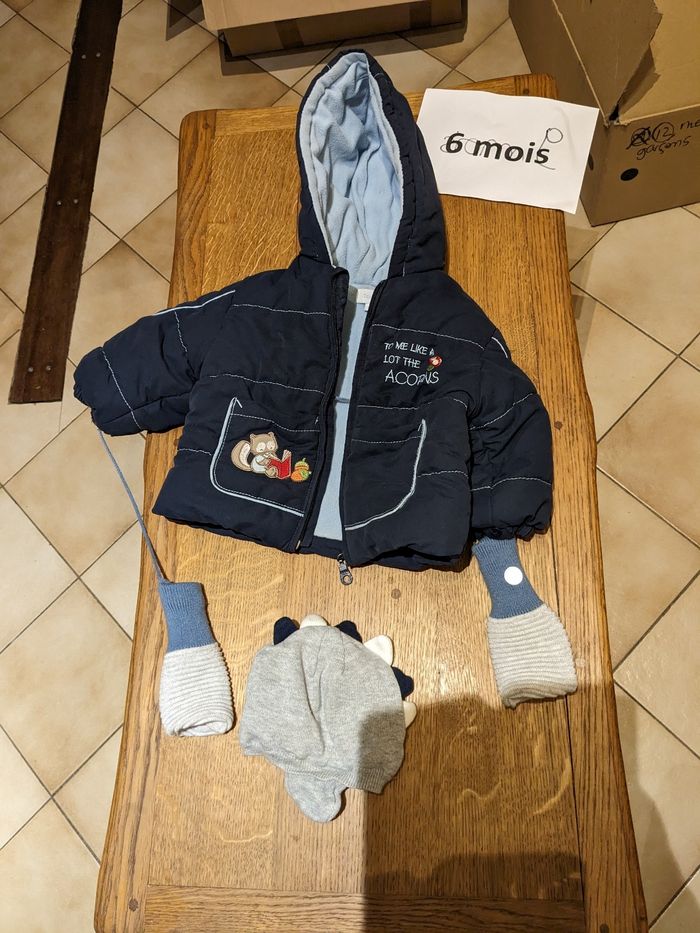 Le manteau taille grand plutôt 9mois. Tout est en bon état.