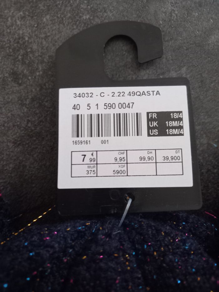 Bonnet bleu marine avec "paillettes" multicolores Neuf, jamais porté car taille petit pour ma fille, ça ne lui couvrait pas les oreilles. Je dirais que c'est plutôt taillé comme du 12 mois.