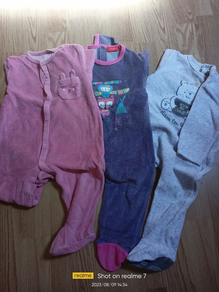 Lot de 3 pyjamas hiver 9 mois 1 Kiabi vieux rose, boutons devant. 1 Tissaia violet 1 Gémo gris à motifs. Bon état