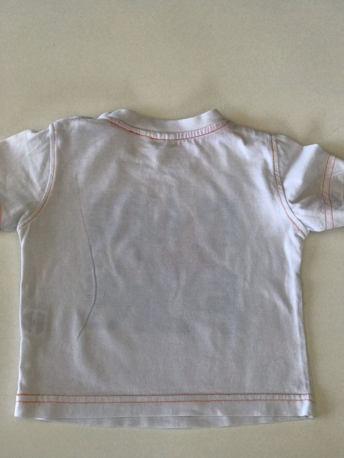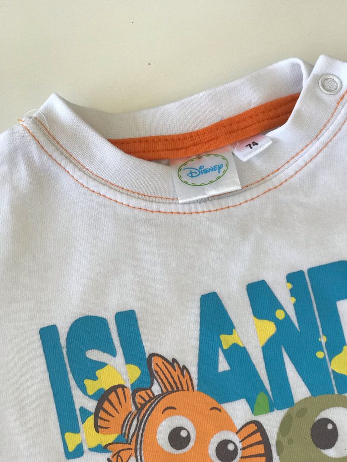 T-shirt bébé Nemo 100% coton. Pressions à l’épaule. Légère tache sous le col à peine visible. Taille 74.