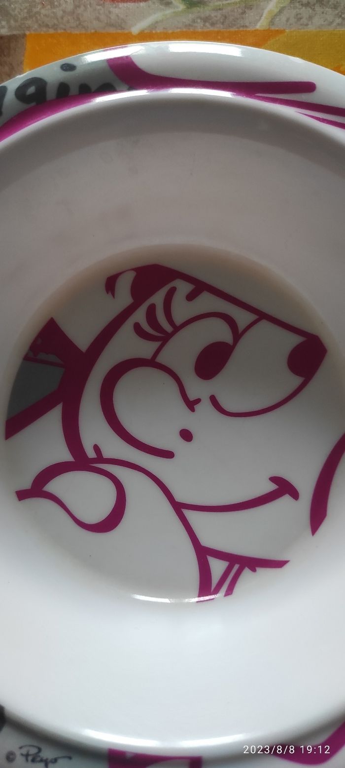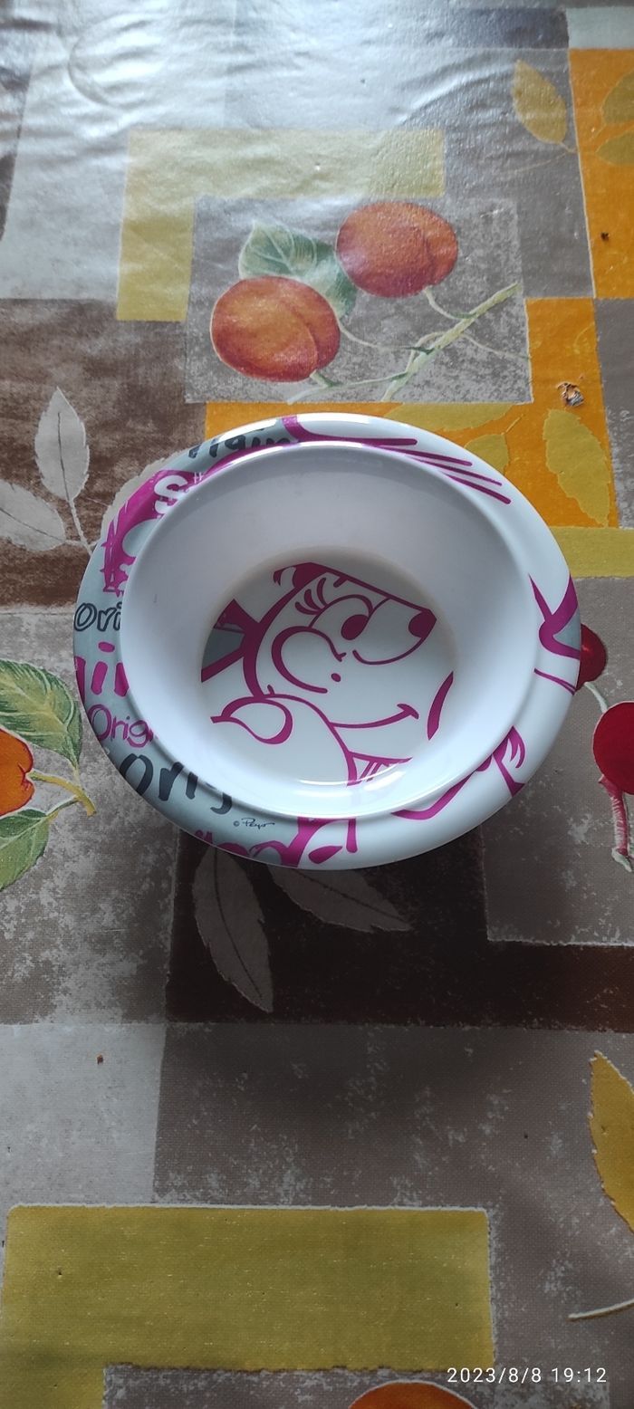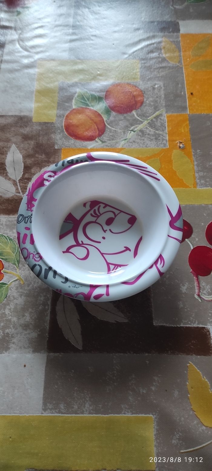 Assiette creuse bébé Schtroumpfette matière mélamine bon état utiliser quelques fois, dimensions 17 cm x 17 cm, aucune rayure ni de tâche.