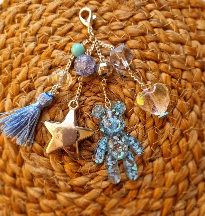 Porte clé, bijou de sac, accroche cartable dans les tons bleu