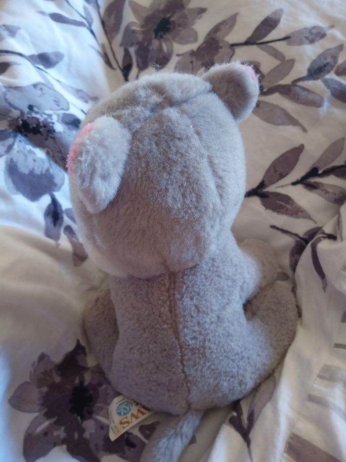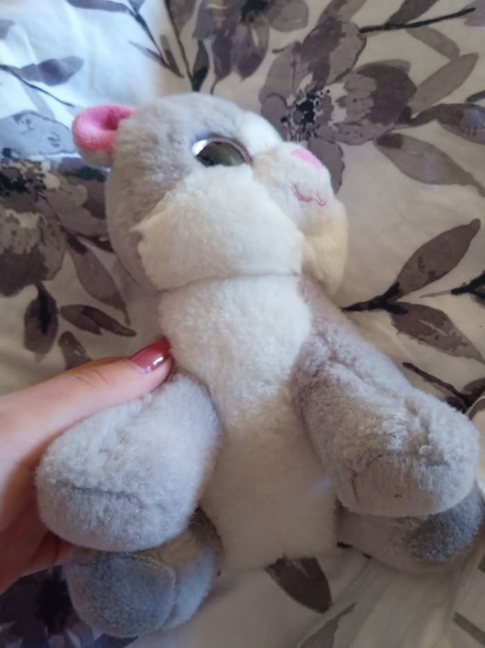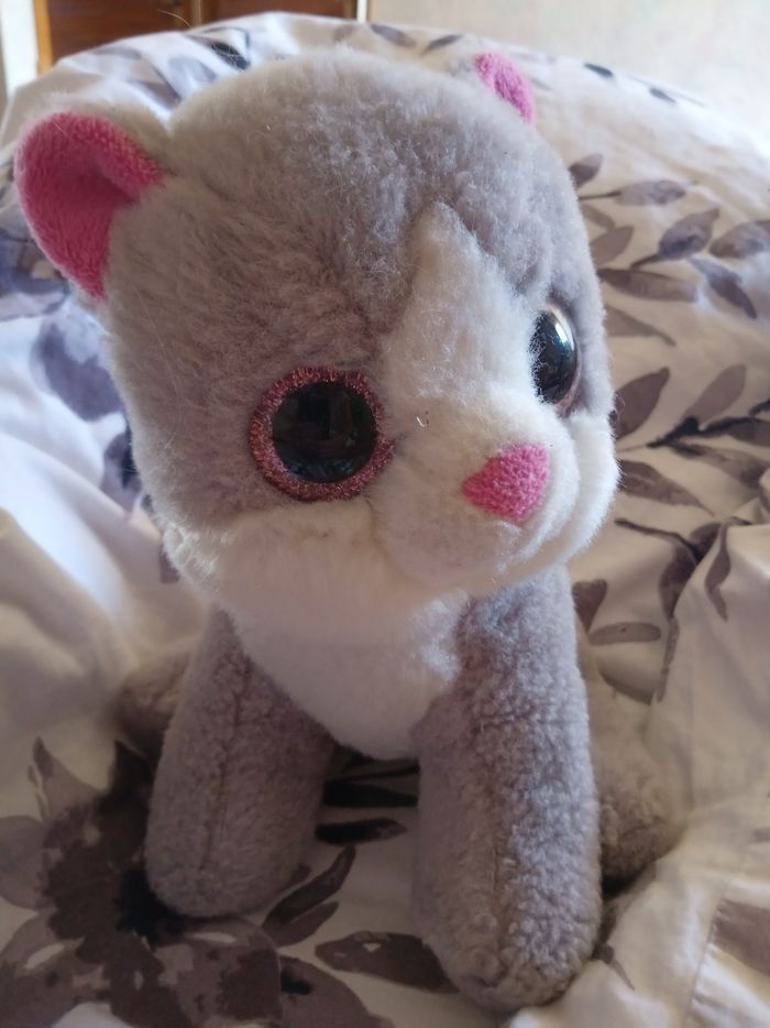 Peluche chat en très bon état comme neuf. Ses gros yeux pétillants brillent grâce aux paillettes.