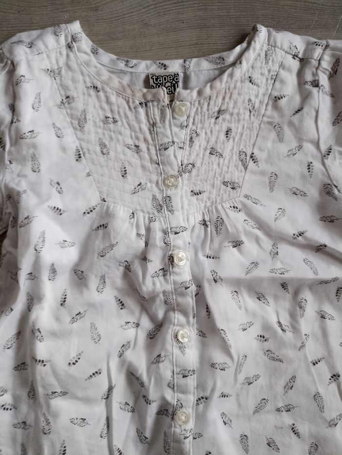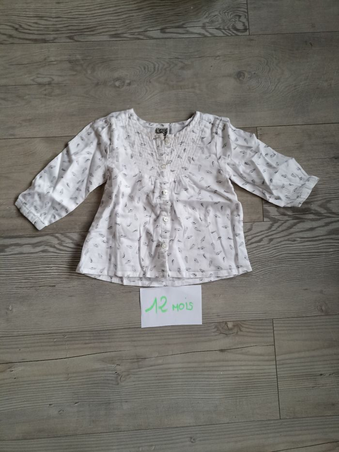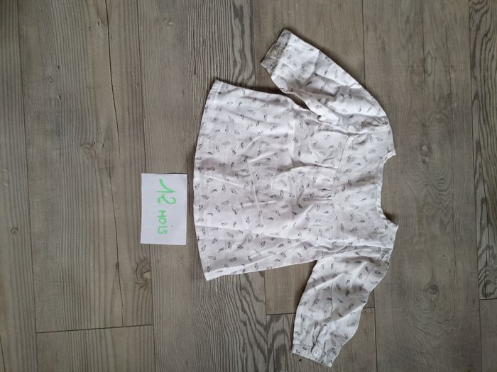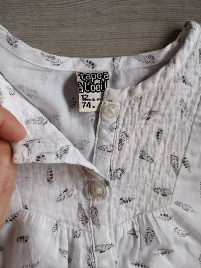 Très belle blouse blanche avec motif en plumes noire et grise . De la marque tape a l'oeil J'ai d'autres articles de marques en 12 mois pour un éventuel lot