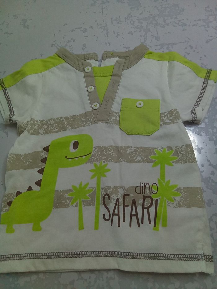 2 ensemble t shirt manches courtes et short Garçon 6 mois Très bon état. Quasi neuf car mis 1 fois Boutons dans le dos pour faciliter l'habillage Thème dinosaure et tracteur