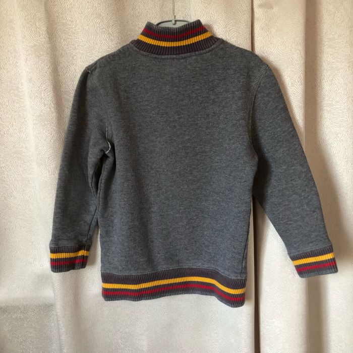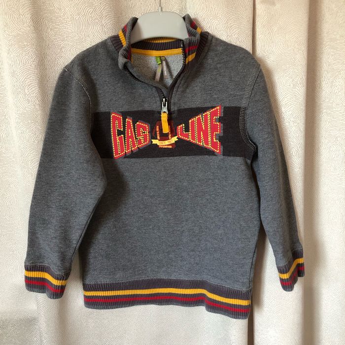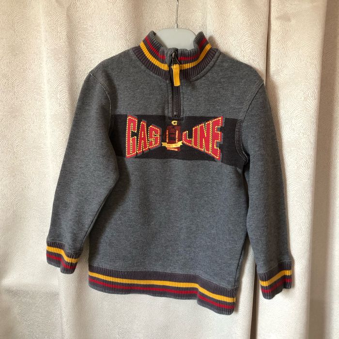 Pull sweat molletonné gris Col camionneur Imprimé devant gasoline Bord côte rayé rouge et jaune Taille 5 ans Orchestra