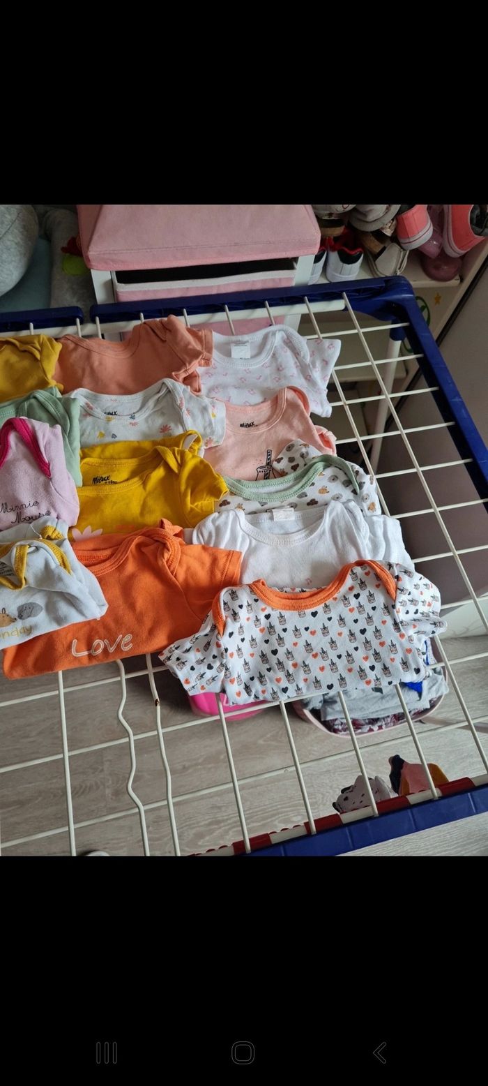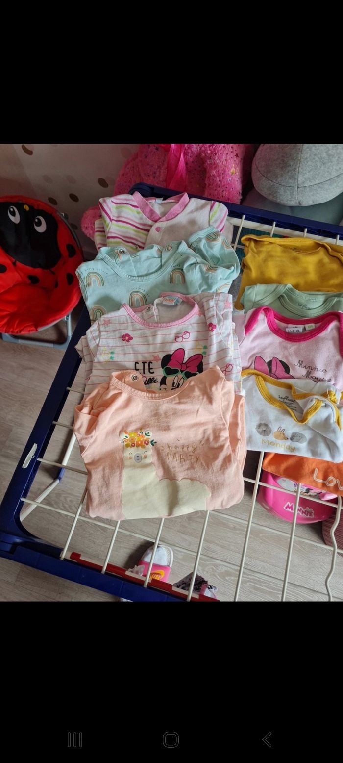 Vend lot taille 6 mois. Le lot contient 4 pyjamas et 13 bodys marque gemo kiabi Disney etc