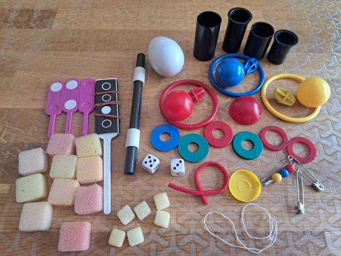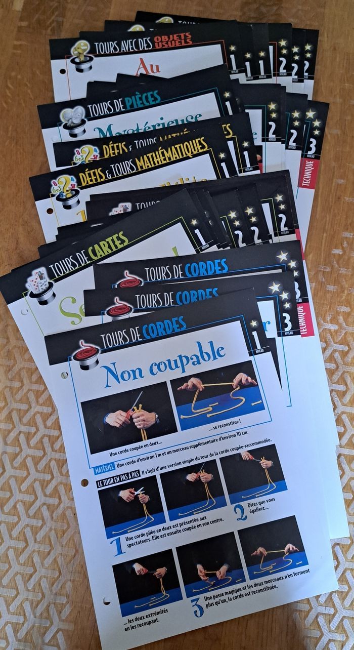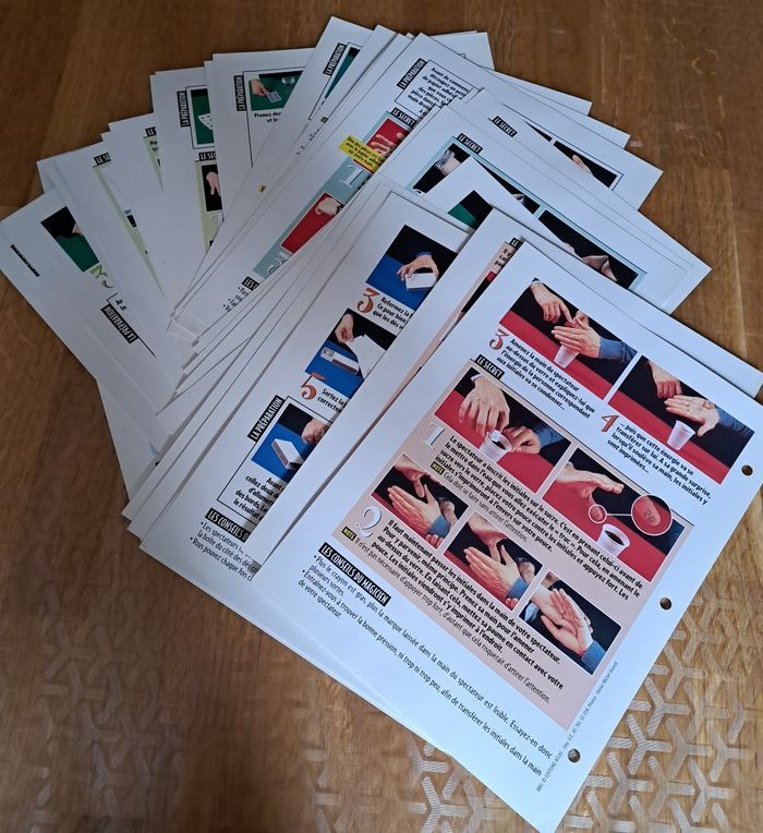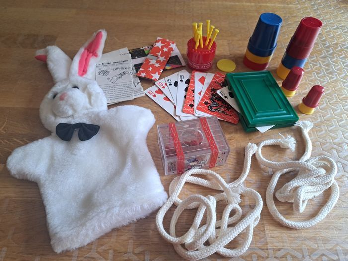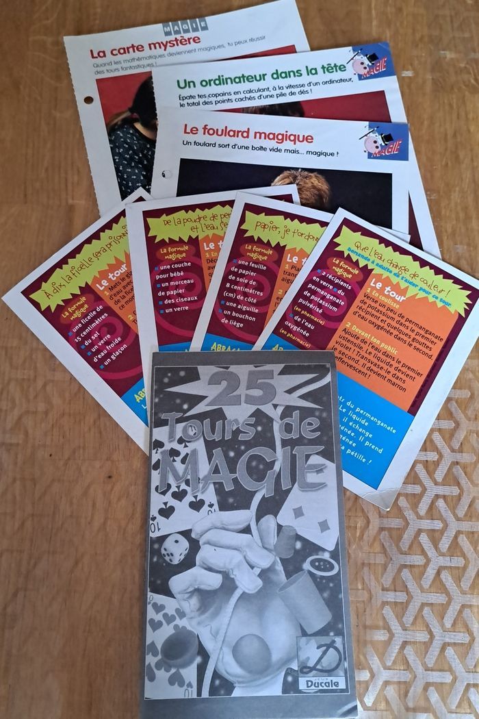 Vends un lot de livres, d'ustensiles et de fiches (une trentaine) pour apprendre et réaliser divers tours de magie. Le double fond du chapeau sera à bien refixer. Liévin (62)