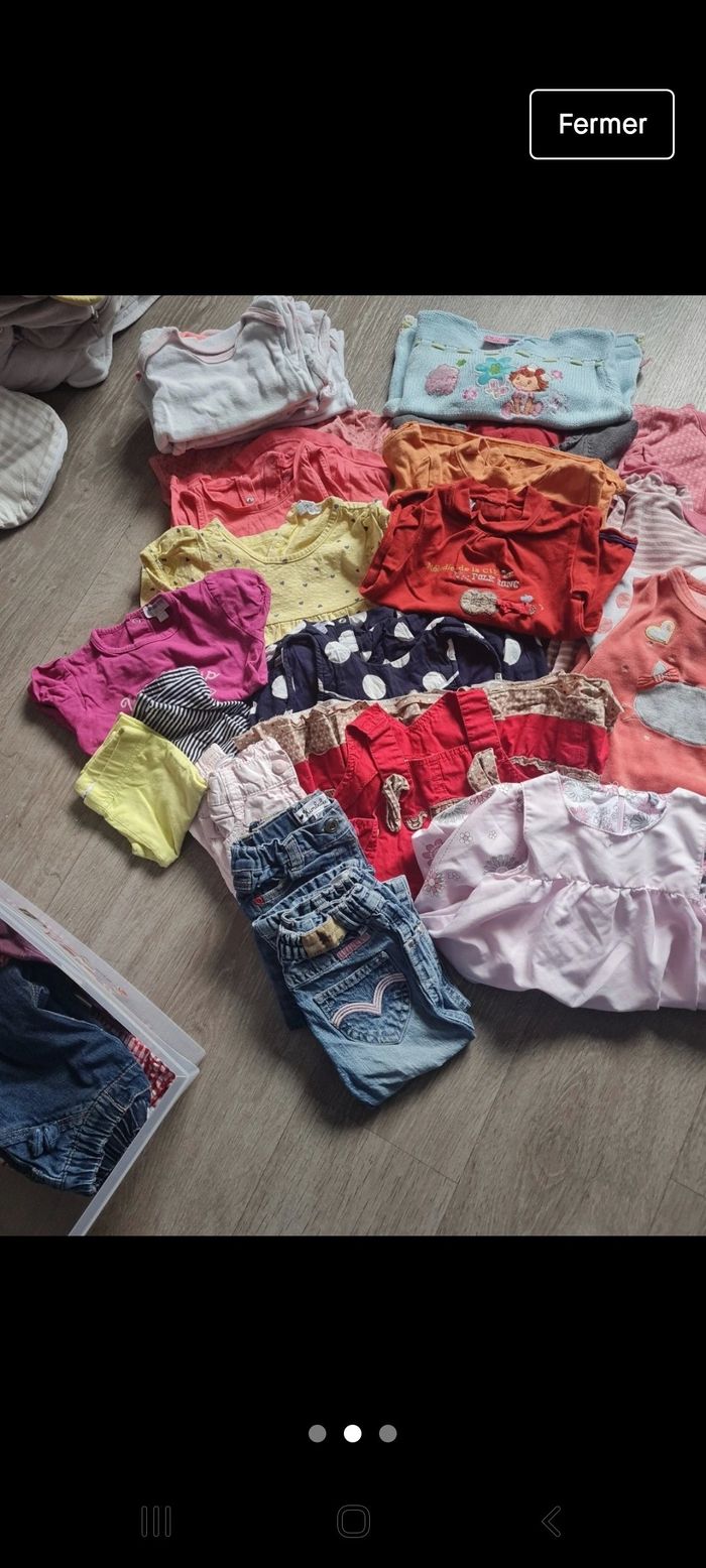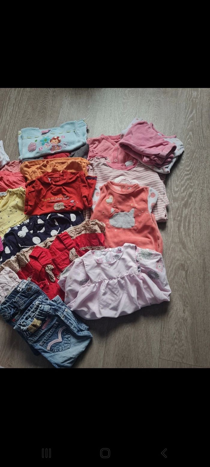 Lot taille 12 mois qui contient 3 jeans 2 leggins 4 robes 4 pyjamas 3 t-shirt 4 pulls et 6 bodys