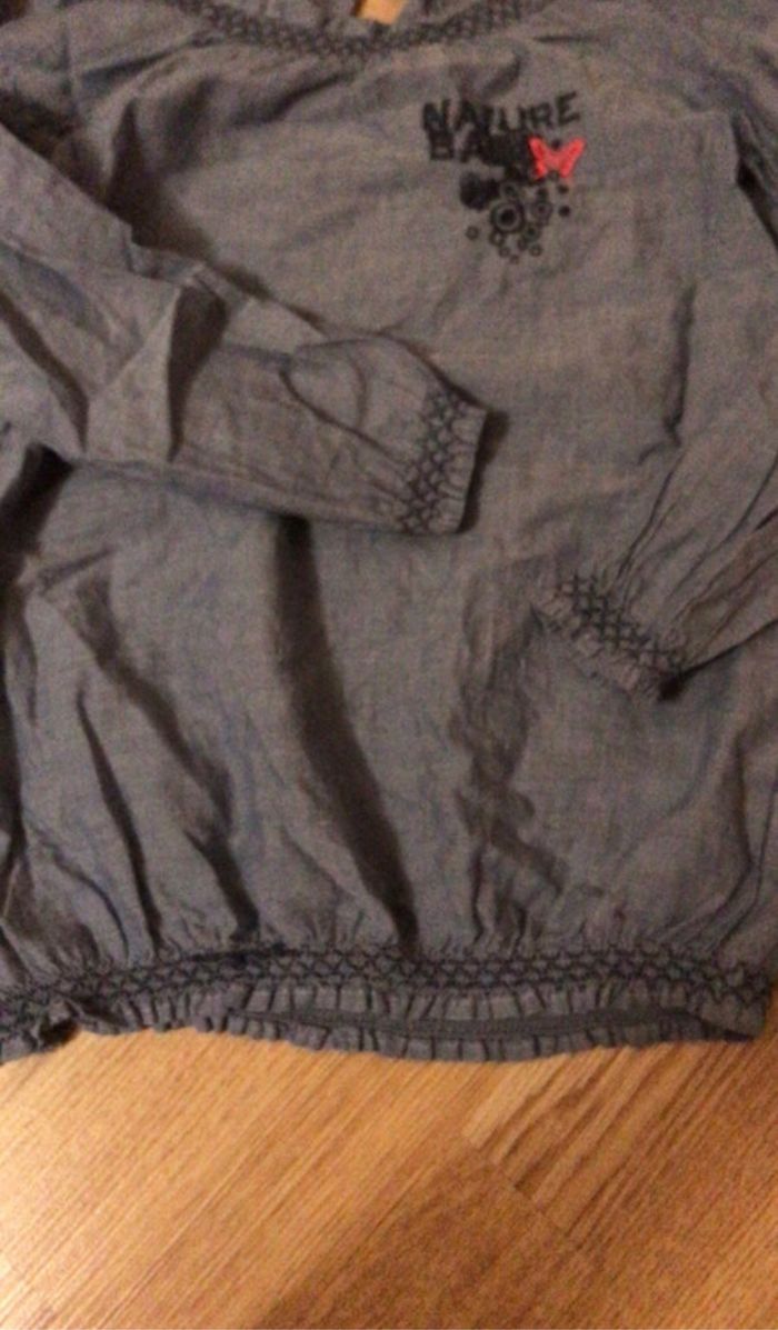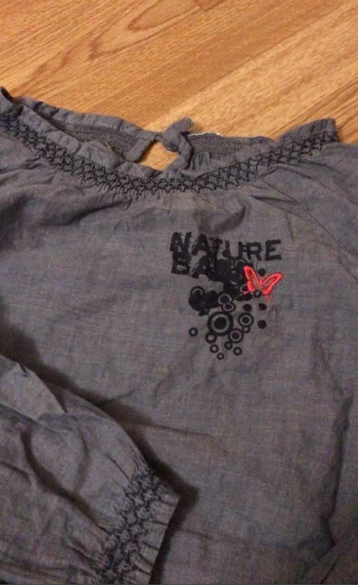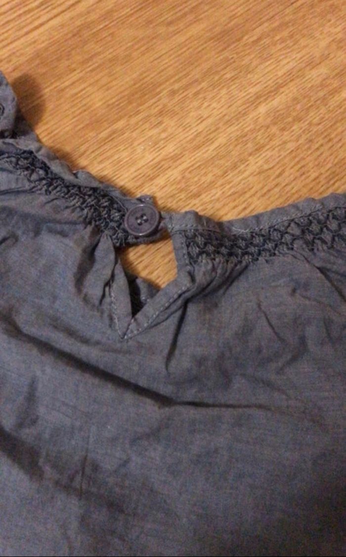 Chemisier long tissu léger bleu jeans finition aux manches , col et taille en smocks élastique , fermeture a bouton à l’arrière Broderies papillon rose