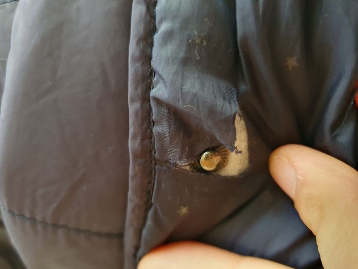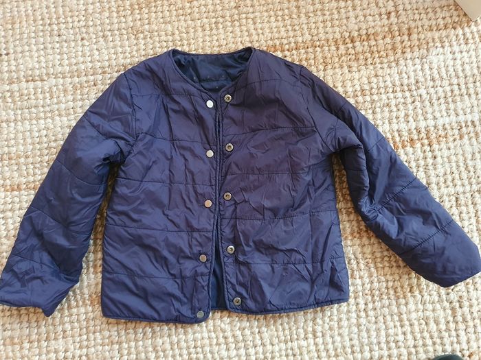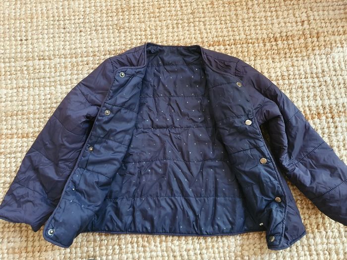 Veste légère de mi-saison, 3-4 ans, réversible initialement mais le côté étoilé à tendance à s'effacer et a un bouton autour duquel le tissu est déchiré (voir photo).