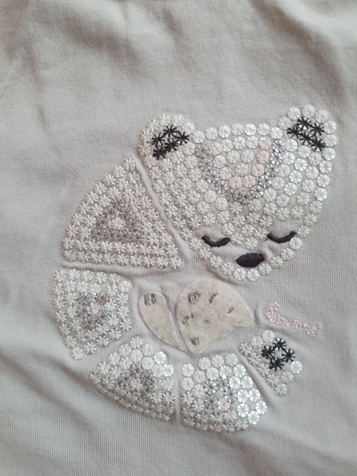 T-shirt manches longues taille 6 mois, usure sur le petit chat du centre devenu un peu grisou...