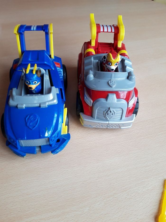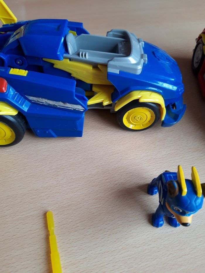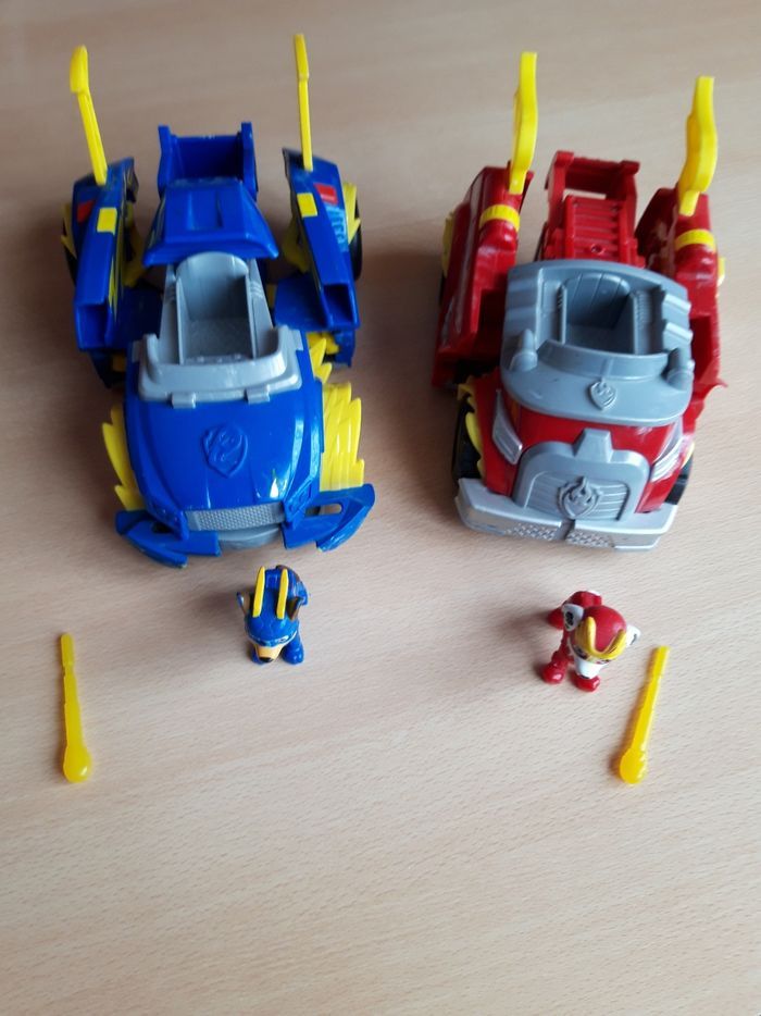 Marcus et Chase de la pat patrouille en tenue de superpatrouille. Livrés avec 2 projectiles au lieu de 4. Les autocollants sont abîmés. Les 2 véhicules se déploient mais celui de Chase est assez difficile à replier.