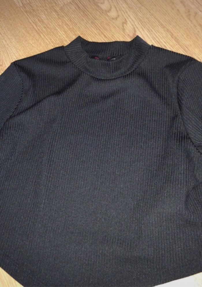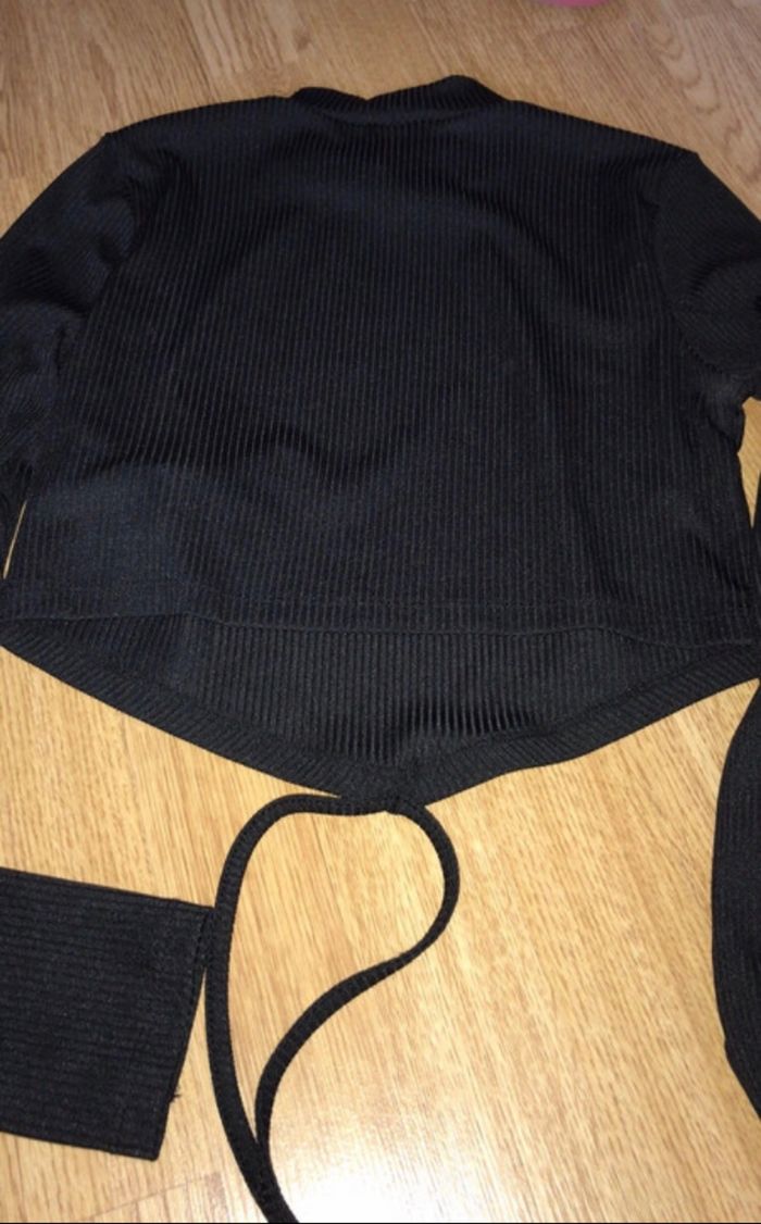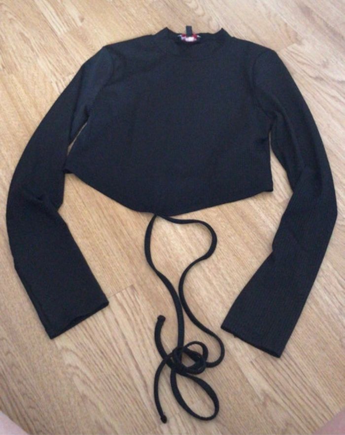 T-shirt crop top manches longues col montant noir côtelé cordon à nouer XS, coupe en V à l’avant