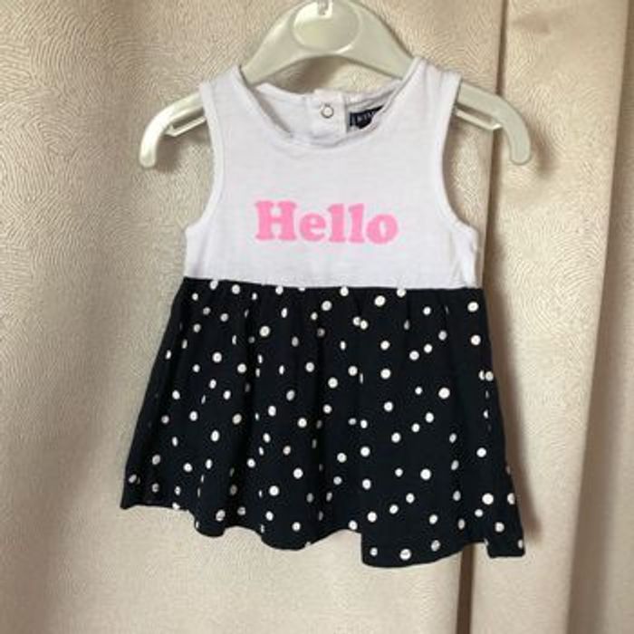 Robe confortable et légère Haut débardeur blanc hello en rose jupe bleu Marine à pois blanc Taille 3 mois 100% coton Kiabi
