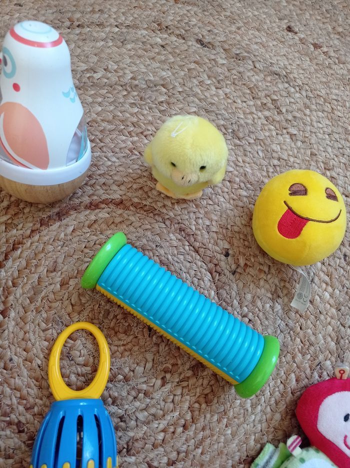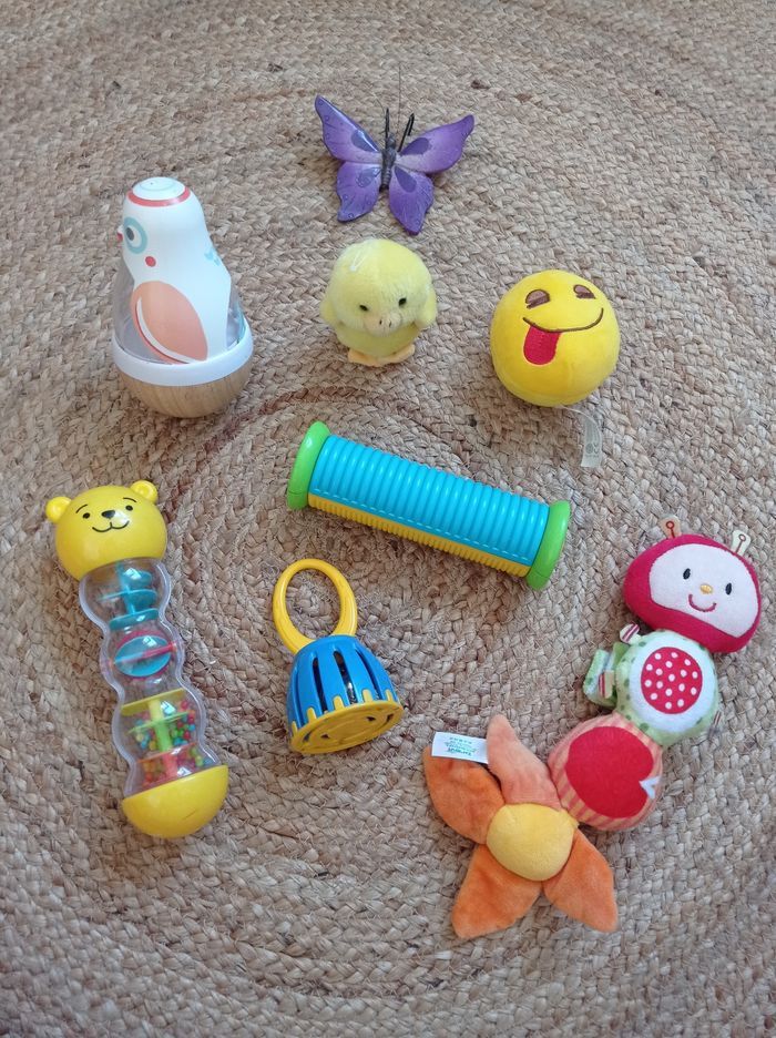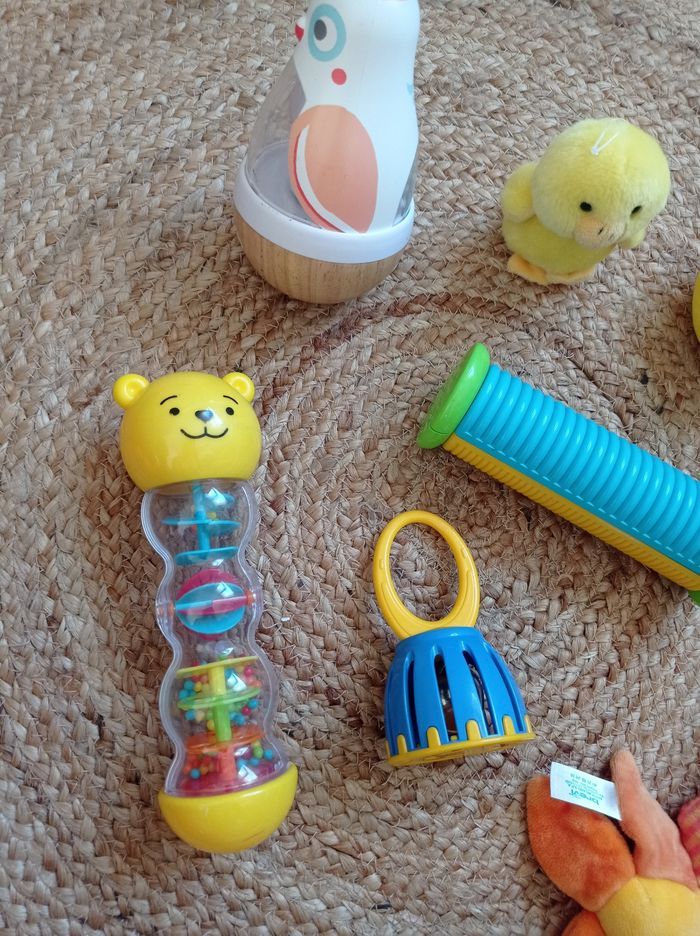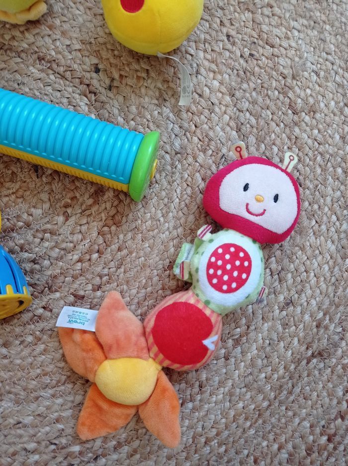 Lot comprenant 7 jouets d'éveil - culbuto bois Djeco - cloche Fisher Price - peluche chenille d'activités Brevi - hochet ours Playgo - bâton de pluie Fisher Price - peluche Emoji - petit poussin Gipsy #douceur_joueteveil C26