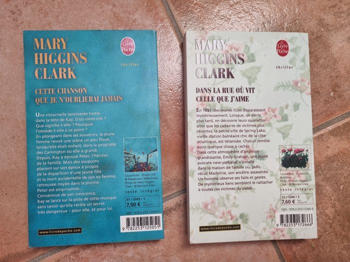 Livre de poche de Mary Higgings Clark - Cette chanson que je n'oublierai jamais -Dans la rue ou vit celle que j'aime 3€ le livre ou 5€ les 2. Très bon état
