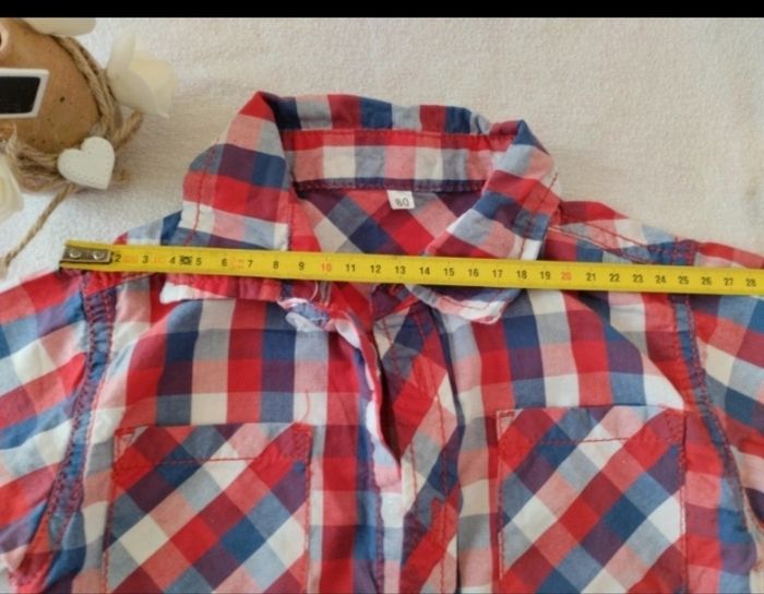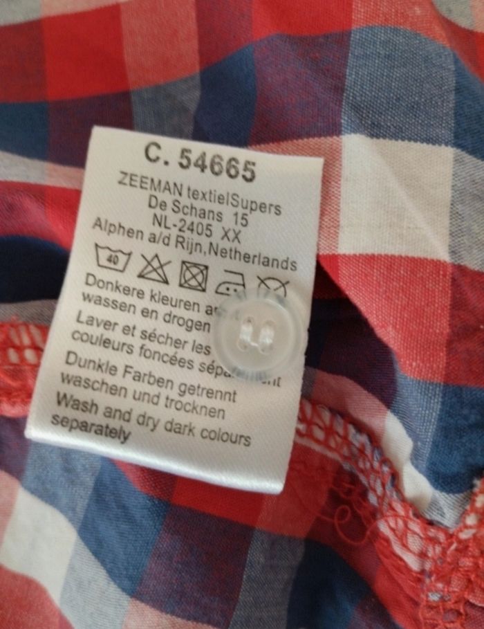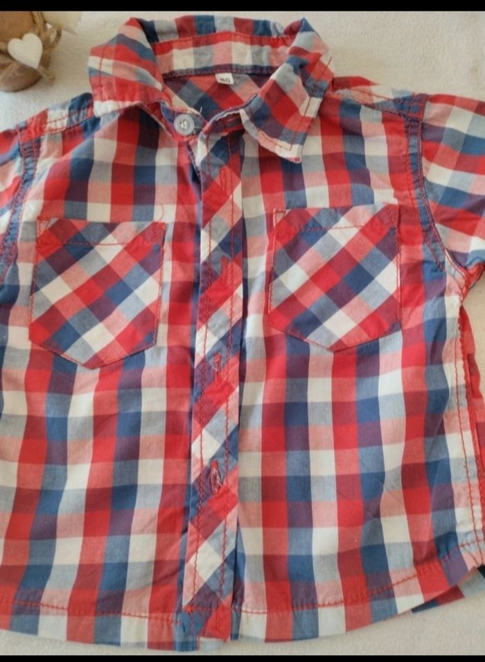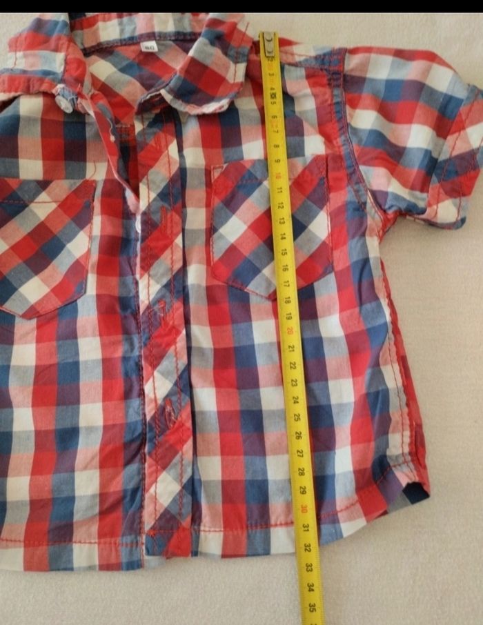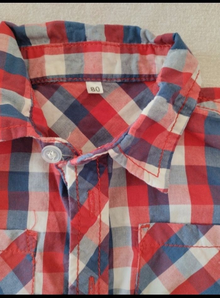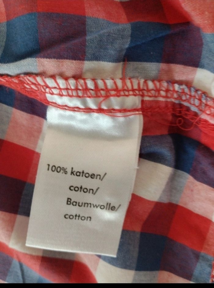Chemisette à carreaux bleu blanc rouge 2 petites poches devant Bouton de rechange encore présent Juste lavée Mensurations sur les dernières photos Taille notée :80cm Marque: Zeeman Réduction sur les lots activée
