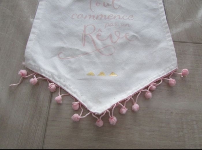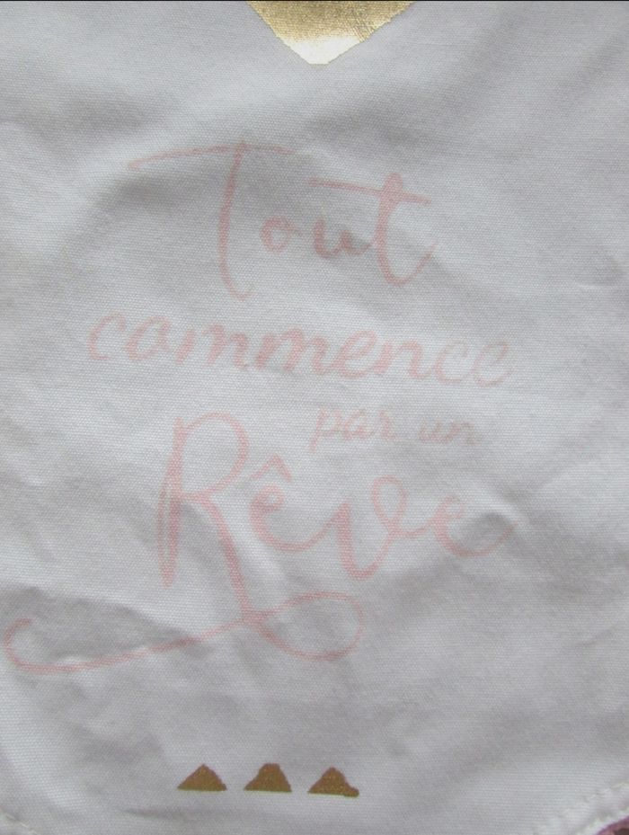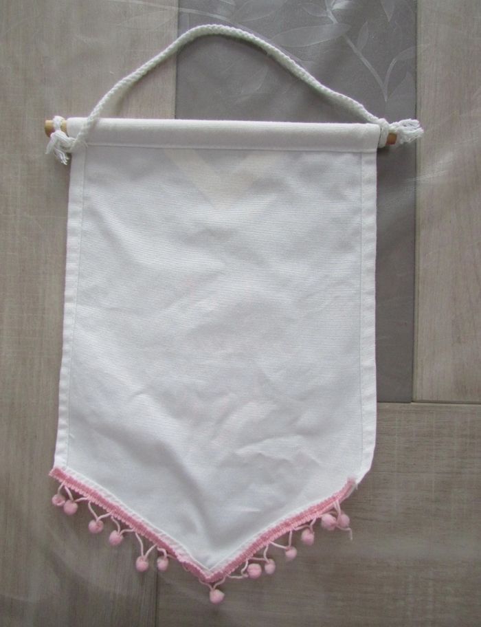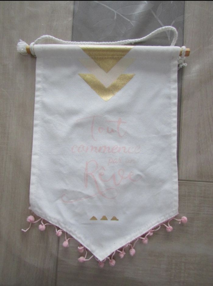 Fanion à accrocher en tissu avec une barre en bois. Ecrit "Tout commence par un rêve..." En très bon état D'autres décorations ici #ysatis13decomaison N'hésitez pas à faire un lot pour profiter des remises activées #tableau #fanion #deco #decoration #chambre #fille #bébé #rose #blanc