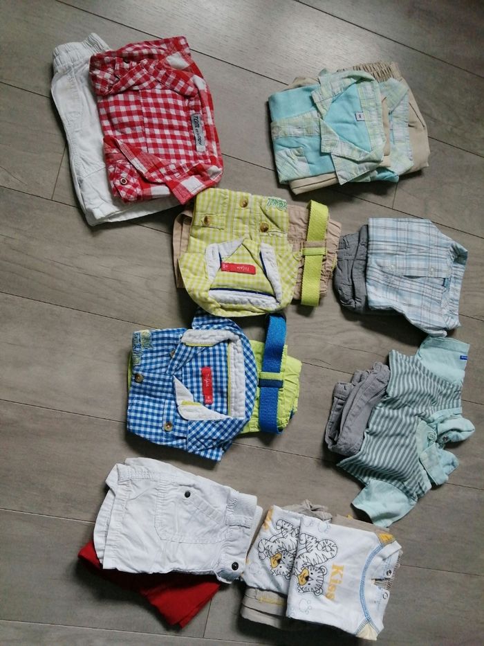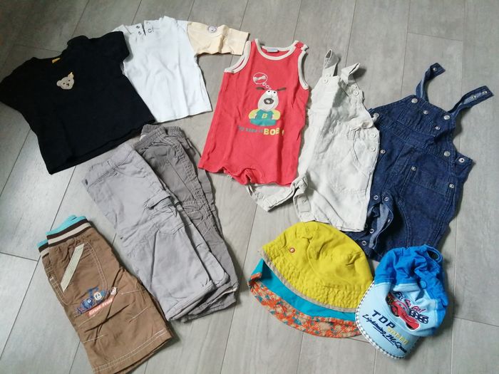 Vêtements garçon 6 mois 9 ensembles short + t-shirt/chemise 4 € l'unité 2 shorts, 1 combishort, 1 pantacourt, 2 pantalons, 2 salopettes 2€ l'unité 1 t-shirt manches longues et 1 t-shirt manches courtes : 1,50€ l'unité 2 bobs et 1 casquette : 1€ l'unité 1 body 0,50€ 1 sweet 2€ 3 polaires à capuche : 2,50 € l'unité Prix régressif au lot