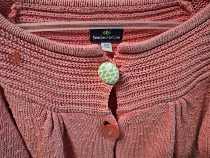 Joli gilet rose fermé en haut seulement par 2 gros boutons, un peu délavé en bas, taille 7 ans, marque Servent Major, porté mais en bon état