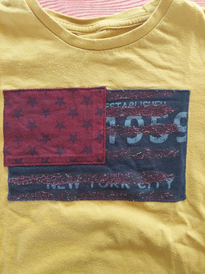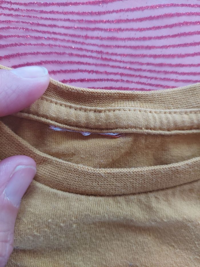 Plus d étiquette de marque / taille Pour la marque il reste quelques fils de la couleur blanc orange de la marque TAO Pour la taille, meme dimensions que tous mes autres 8ans en lignes Tee shirt en bon etat, porté (voir photo de la maille avec lavage) une petite tache au bras #garcon8_mondressing11_bv