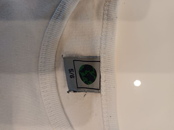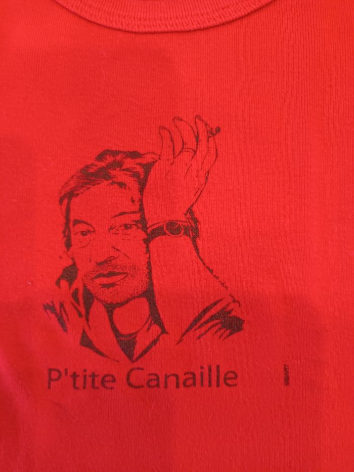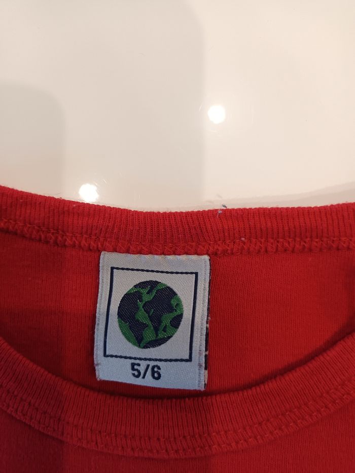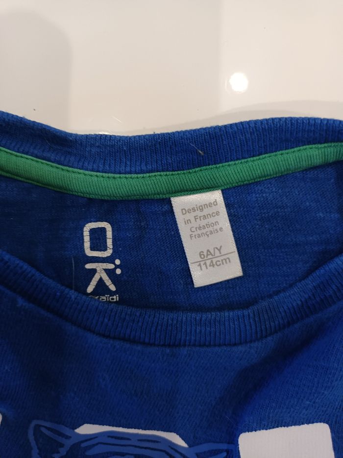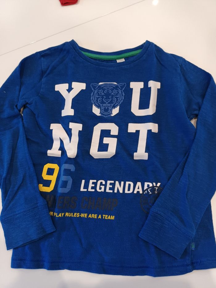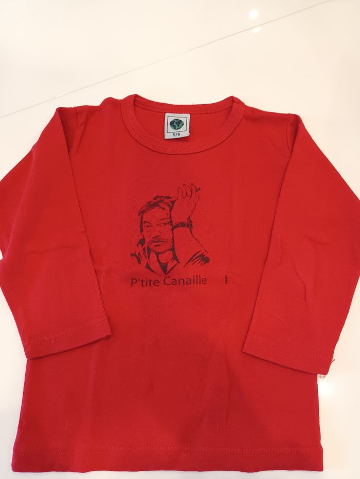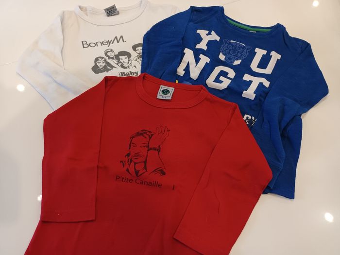 Lot composé d'un t shirt manches longues bleu électrique Okaidi taille 6 ans, d'un t shirt manches longues rouge Gainsbourg taille 5/6 ans et d'un t shirt manches longues blanc visuel Boney M taille 5/6 ans.