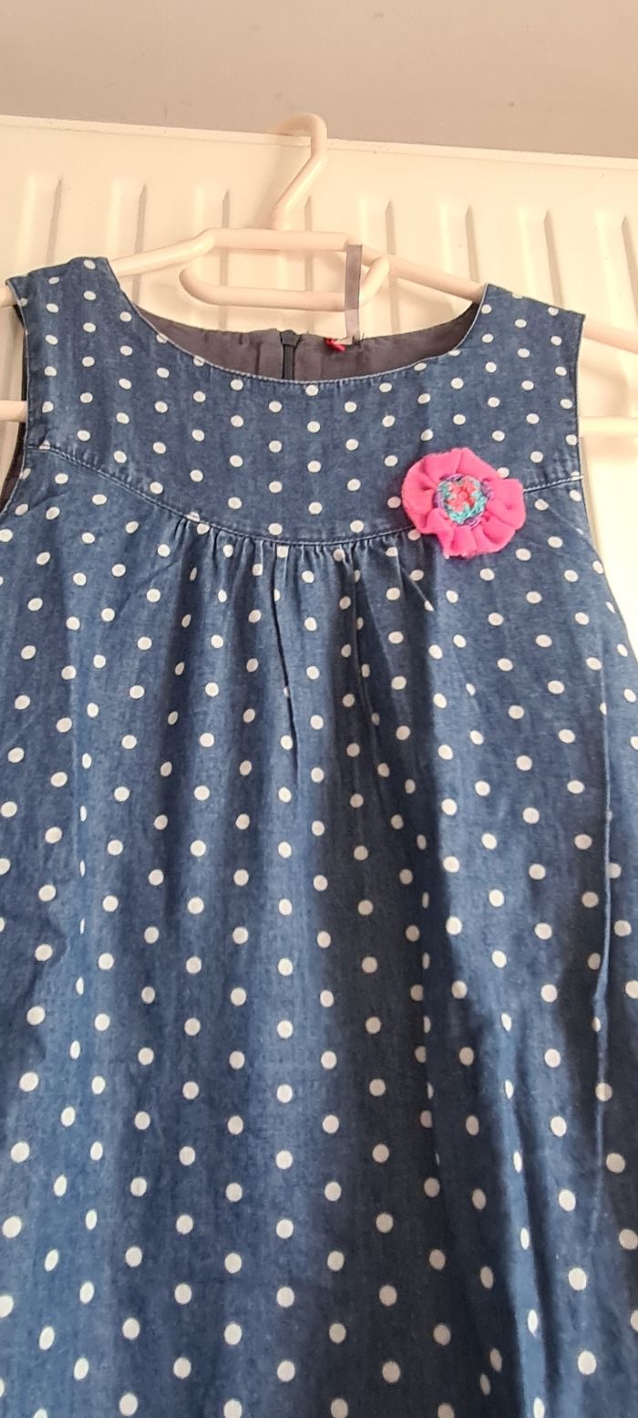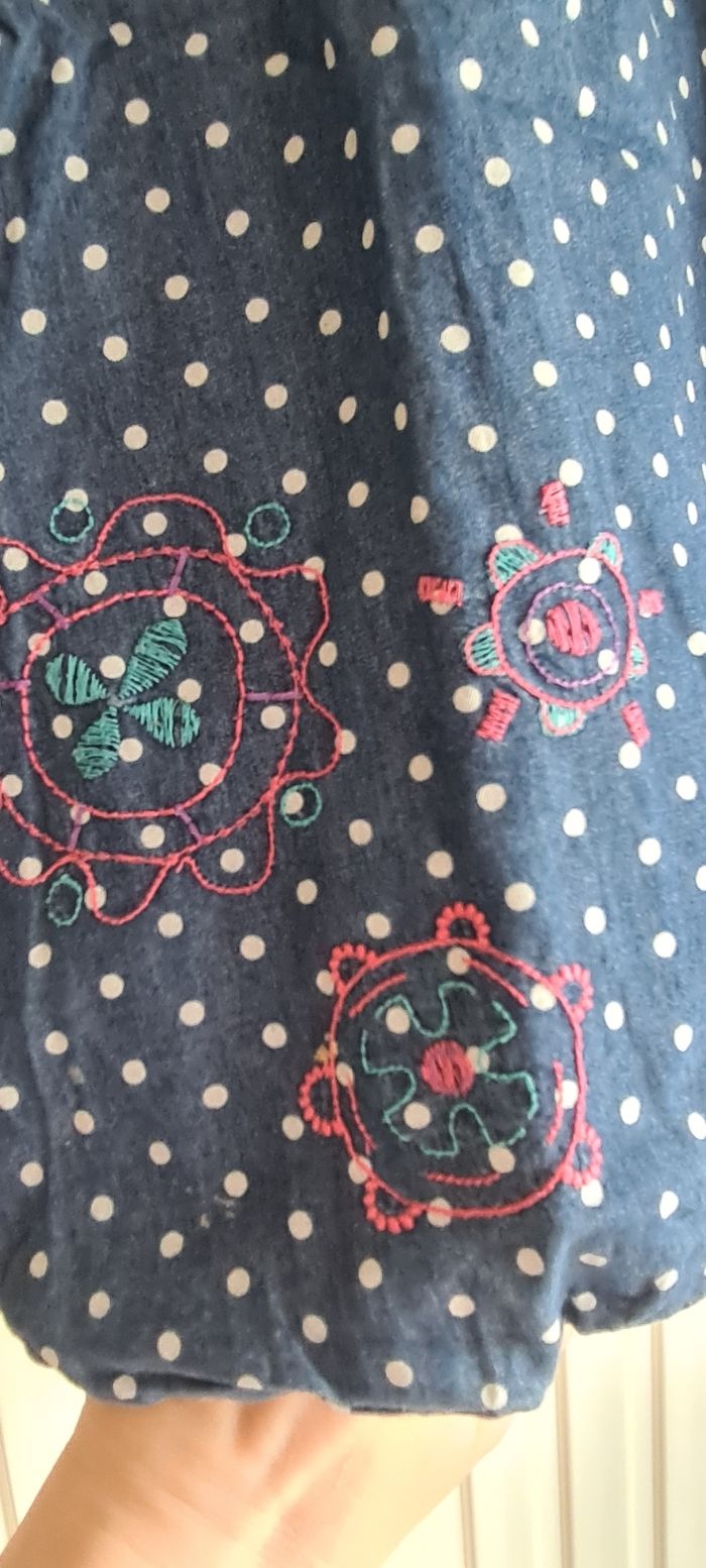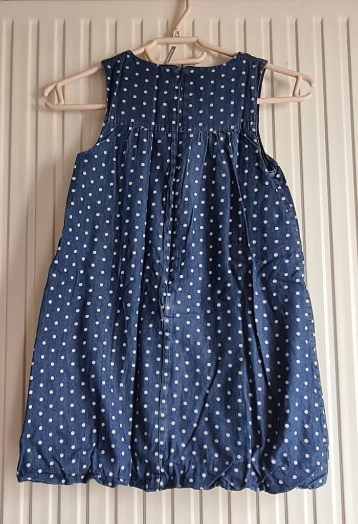 Robe longue mi-saison, possibilité de mettre un tee-shirt sous la robe pour les jours plus frais La robe est doublée. Fermeture éclair à l'arrière pour l'enfiler facilement. Tissus style jeans à pois blanc, avec broderie en forme de fleurs sur le bas. Très bon état. Marque Orchestra. Taille 8 ans.