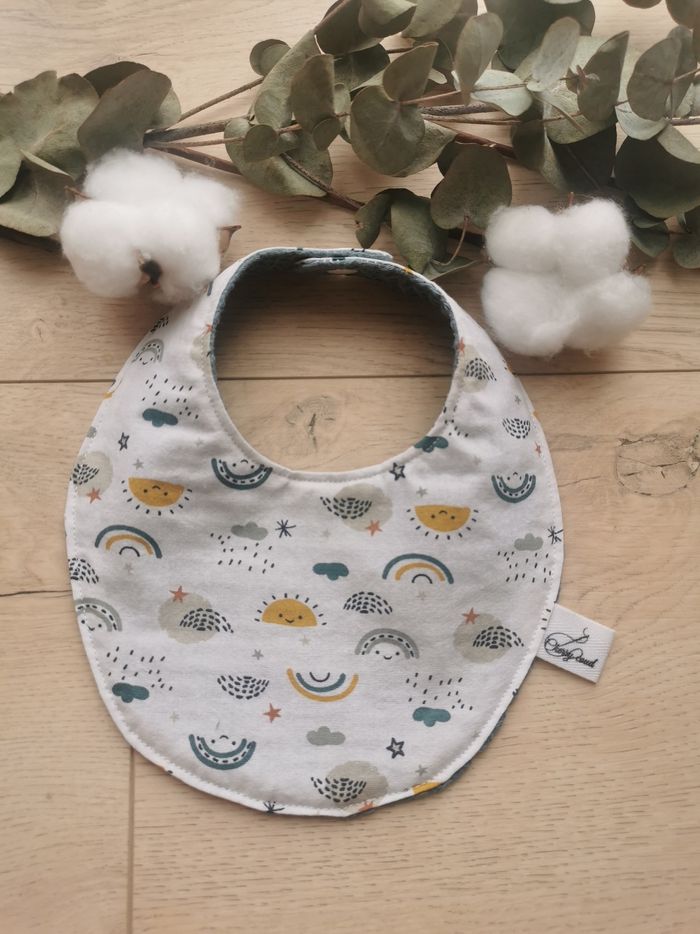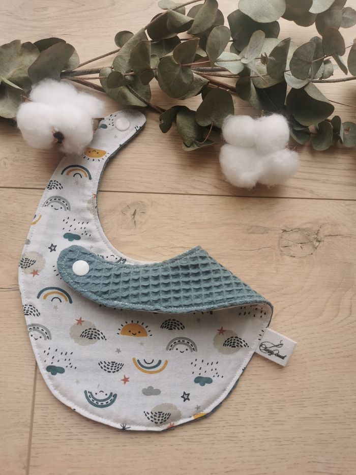 Bavoir fait main. Coton Oeko Tex motif arc en ciel. Nid d'abeille Oeko Tex bleu ancien. Dès la naissance jusqu'à 18 mois environ.