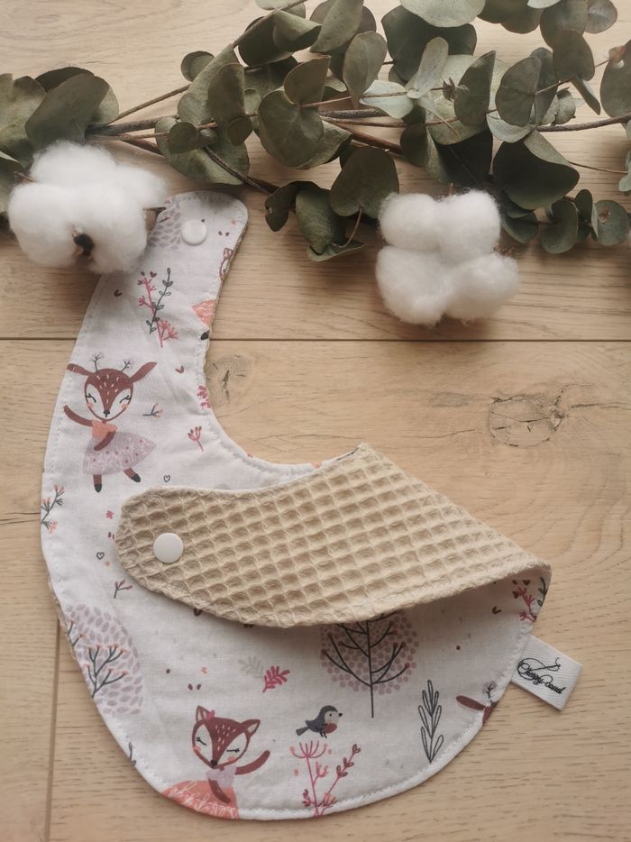 Bavoir fait main. Coton Oeko Tex motif forêt. Nid d'abeille Oeko Tex écru. Dès la naissance jusqu'à 18 mois environ.