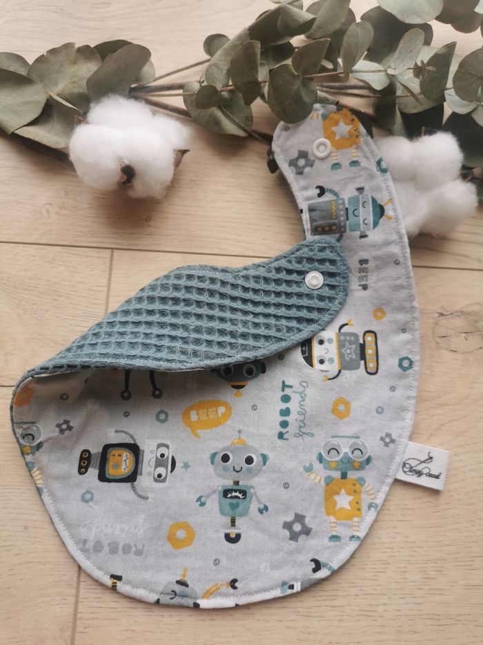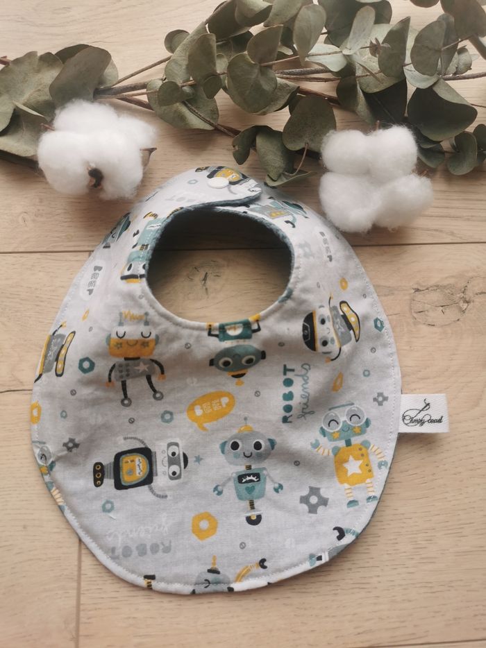 Bavoir fait main. Coton Oeko Tex gris motif robot. Nid d'abeille Oeko Tex bleu ancien. Dès la naissance jusqu'à 18 mois environ.