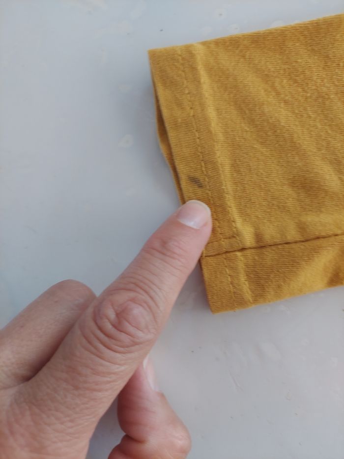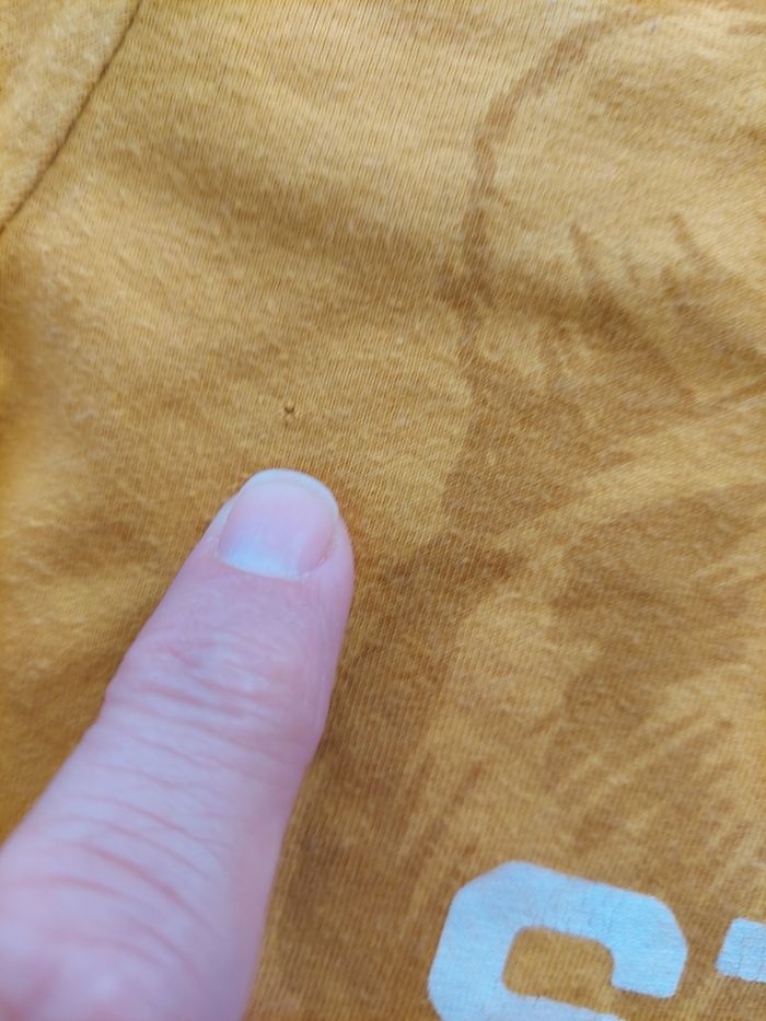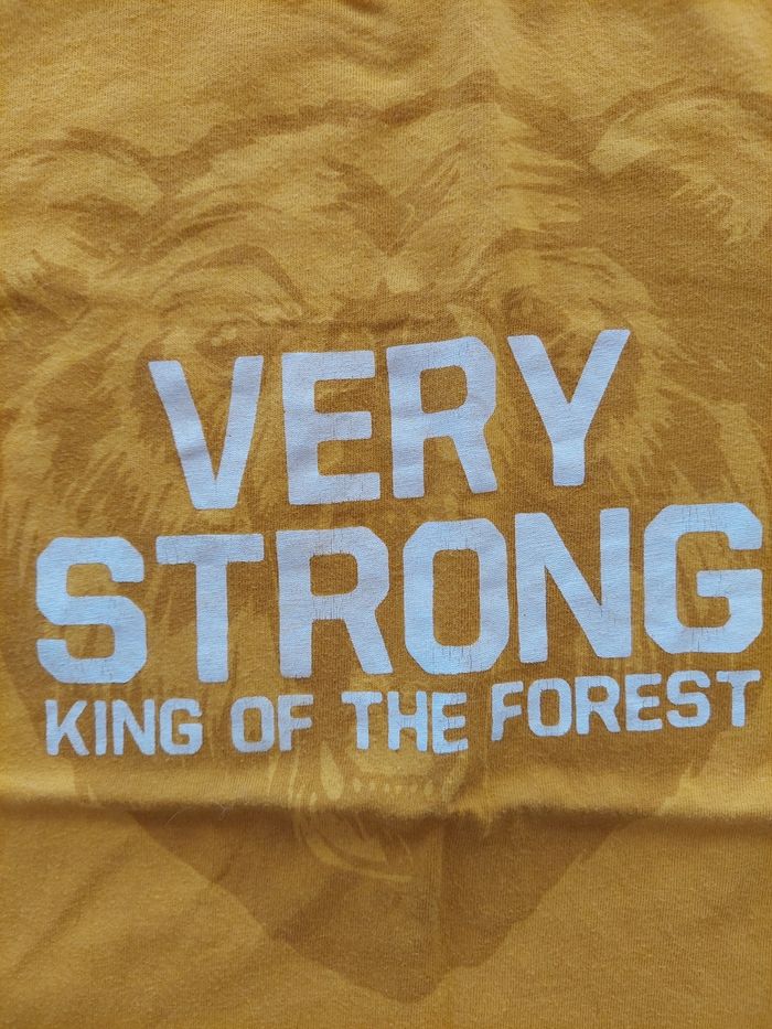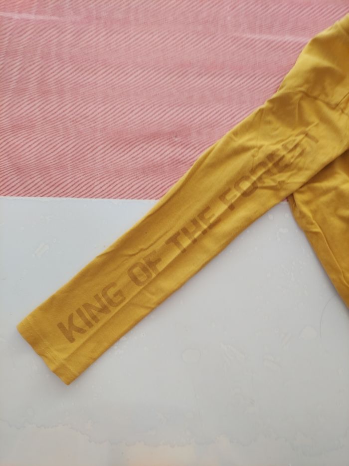 Tee shirt kiabi 8ans moutarde, 2 petits trous, 1 devant , 1 derrière, une tache en.bout de manches Écriture sur le.bras #garcon8_mondressing11_bv