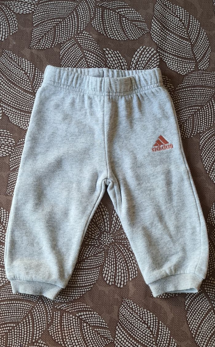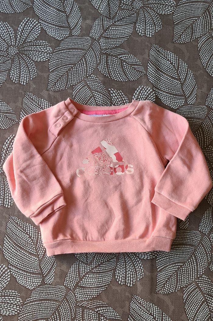 Jogging Adidas très bon état composé d'un sweat-shirt de couleur rose saumon et d'un pantalon de couleur gris, taille 6-9 mois.