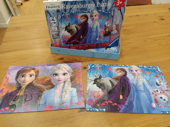 Deux puzzles La Reine des Neiges, 2 fois 12 pièces, en bon état général ! Juste une pièces qui a un morceau de scotch mais cela ne se voit vraiment pas ! Marque Ravensburger 👍