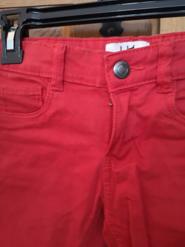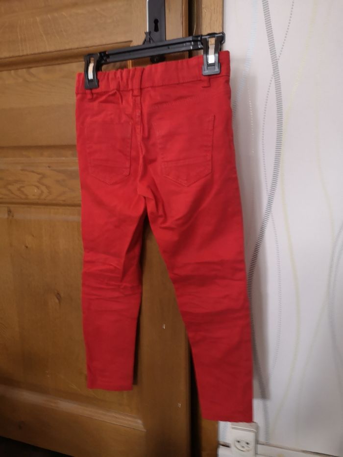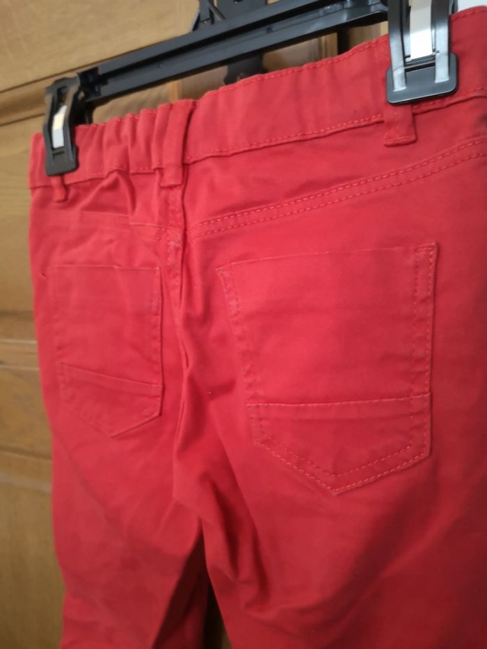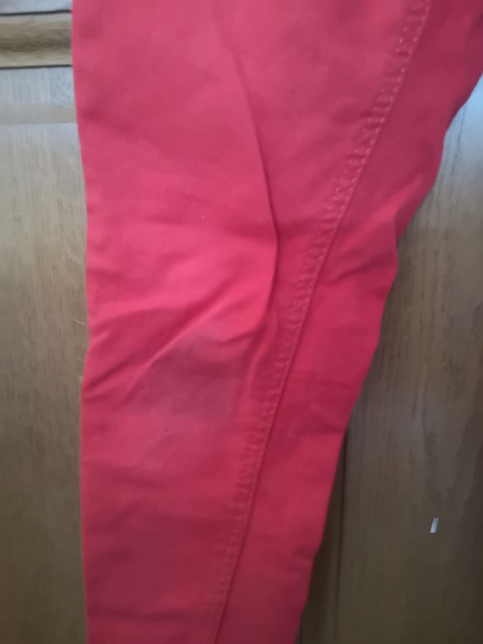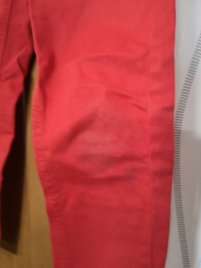 Pantalon rouge, La Halle. Porté plusieurs fois, quelques marques d'usure sur les genoux (voir photos). C'est une taille réglable par élastique.