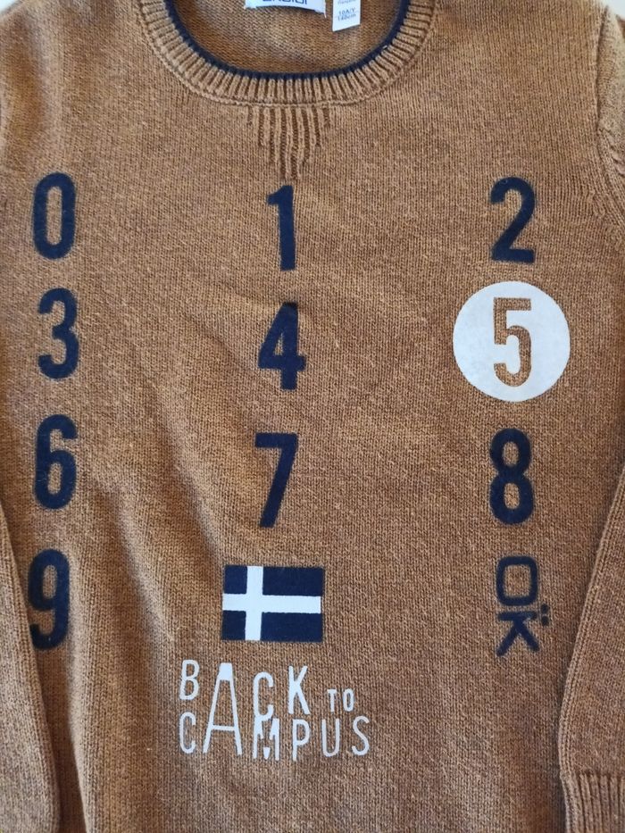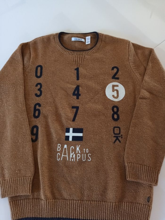 Pull camel avec chiffres floqués.