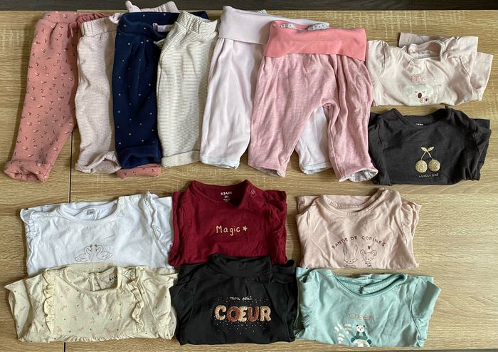 Lot de pantalon, tee-shirt manche longue. 14 pièces. Taille 3 mois, pour automne, hiver. Description selon l’ordre des photos: - Pantalon Marque Kiabi - Marqué KIABI -Marque GEMO - Marque KIABI - Pantalon réversible et évolutif, allant de 3 à 6 mois. Marque OBAIBI - Pantalon également réversible et évolutif, allant de 3 à 6 mois. Marque OBAIBI - tee shirt manche longue, marque dans l’ordre des photos : AUTRE, KIABI pour les 4 à suivre, OBAIBI pour les deux modèles, et finalement, KIABI.