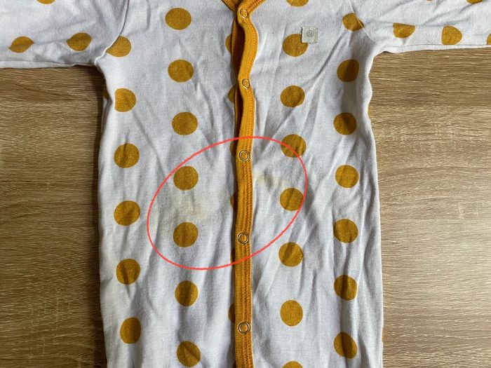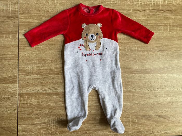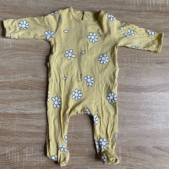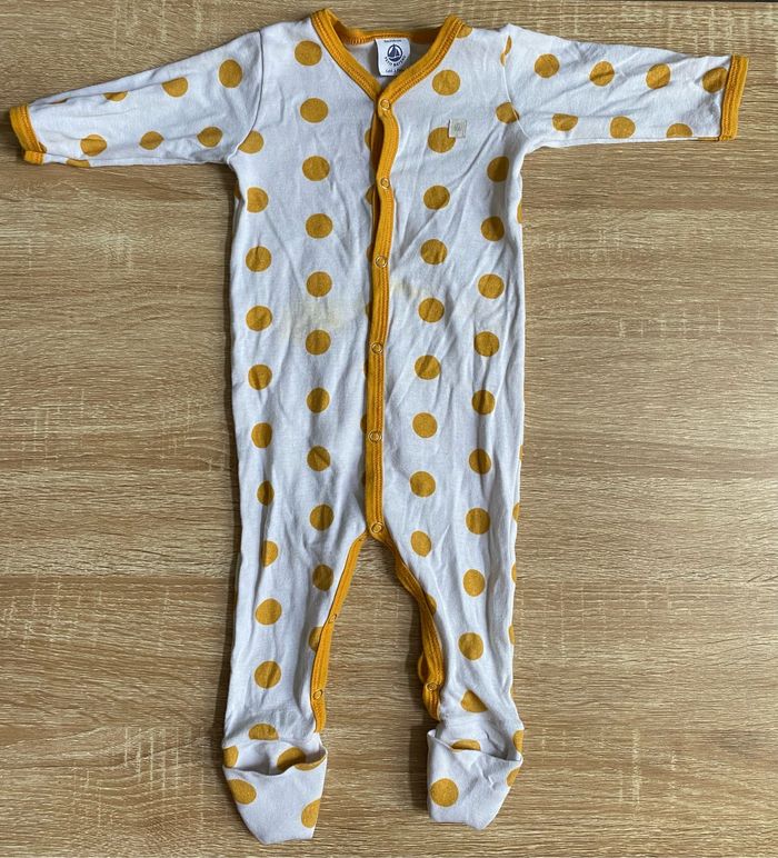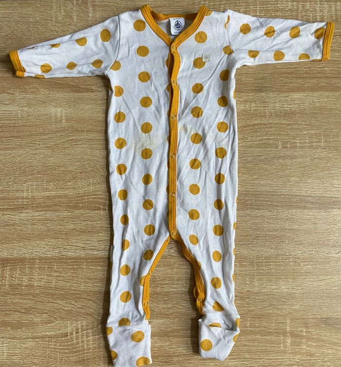 Lot de 4 pyjama, dont 3 légers et 1 épais. Taille 3 mois. Description selon l’ordre des photos. - Pyjama épais, marqué MES PETITS CAILLOUX, porté 1 fois. - Pyjama léger, sans pieds, s’ouvrant par devant. Marque Autre. Porté 1 fois. - Pyjama léger, s’ouvrant par devant. Marqué PETIT BATEAU. Pyjama sans pieds, avec possibilité de couvrir les pieds, voir photos. Pyjama présentant une légère tâche, voir photo. - Pyjama léger, marqué KIABI. Porté 1 fois